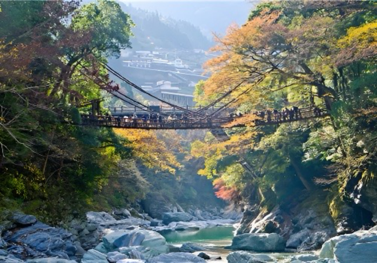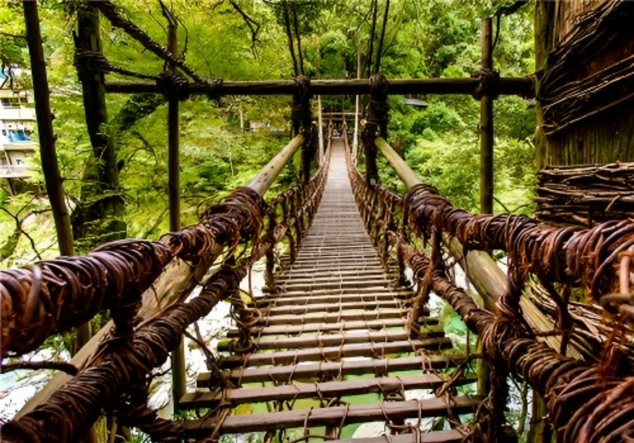 【祖谷溪藤橋】:祖谷溪藤橋是自然與人文交織的奇蹟,千年藤蔓訴說著歷史傳奇,搖晃的橋面挑戰著勇者的膽識。在這裡,每一步都踏過歷史,每一眼都望見自然,是探秘四國不可錯過的絕景;
