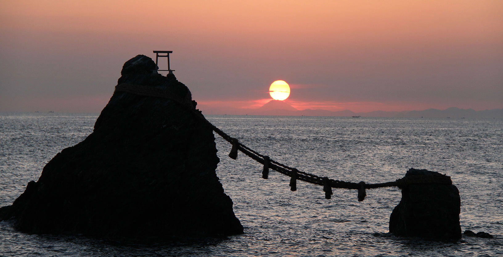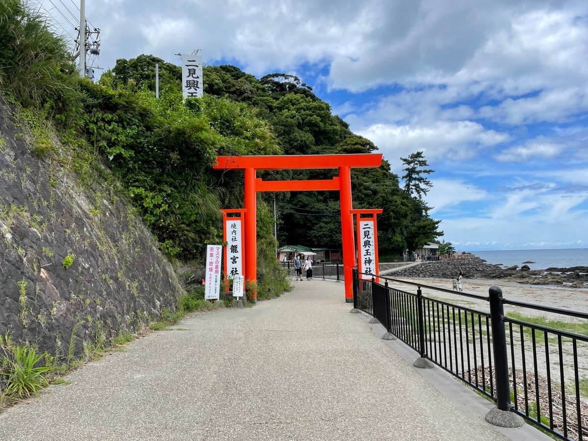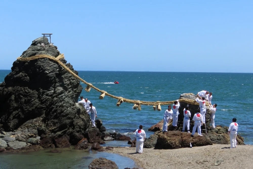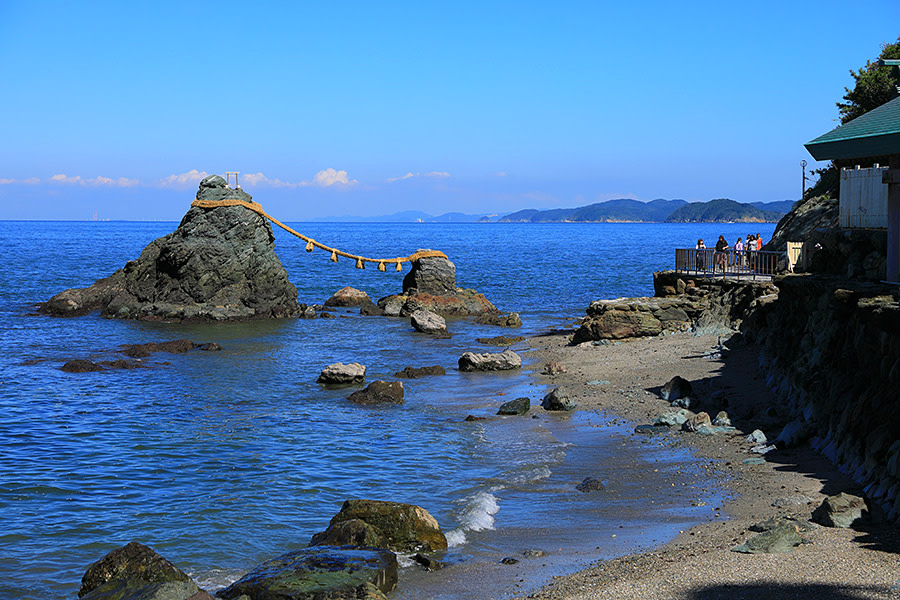 二見興玉神社境內的夫婦巖是非常知名的戀愛觀光景點,是二見浦上一大一小的岩石,傳說中這是祭祀猿田彥大神的興玉神石和天照大神的鳥居。男巖高9公尺,女巖高4公尺,中間有著大注連繩連結,全長35公尺,每年更換三次,祈求夫婦圓滿、交通安全、厄除等等。