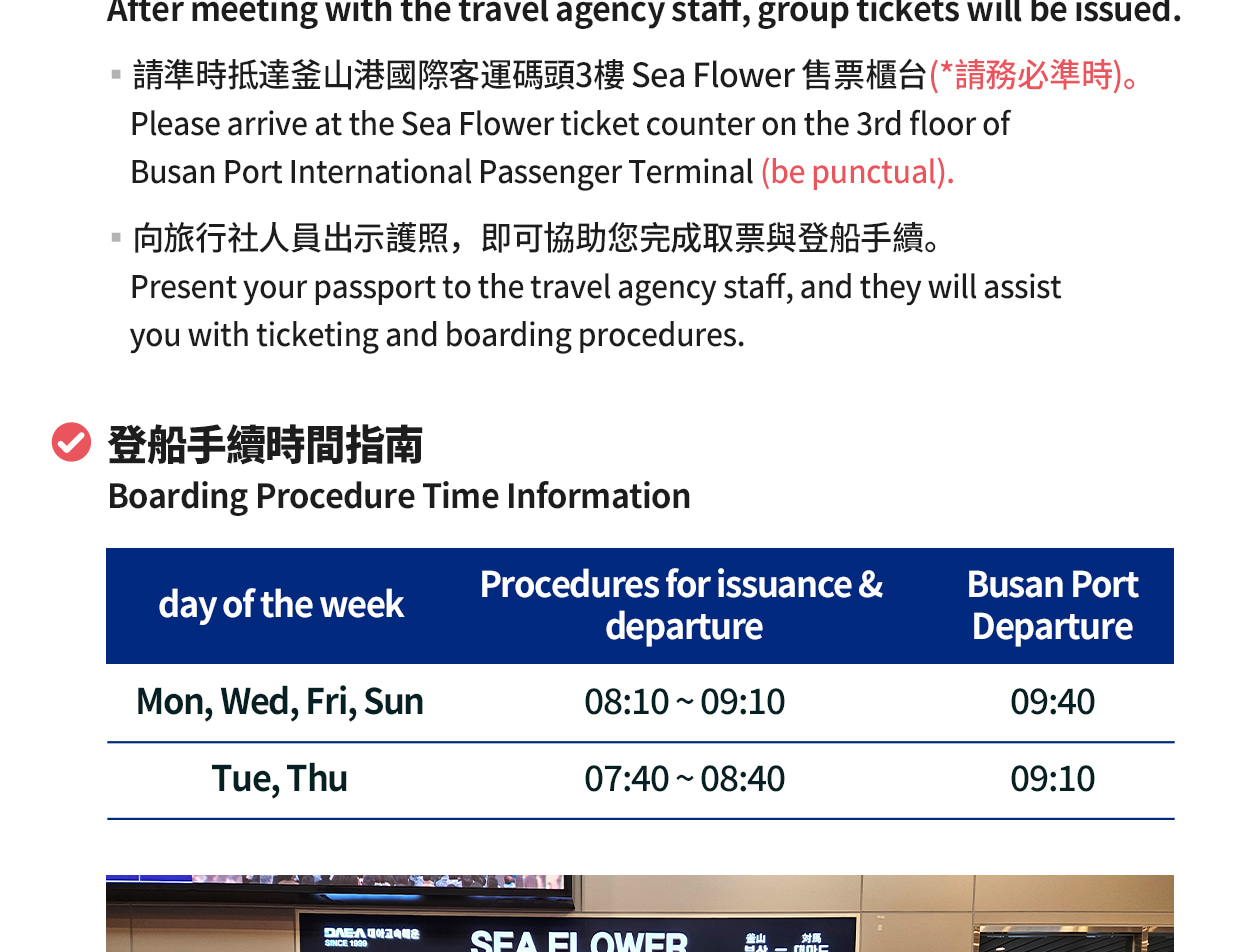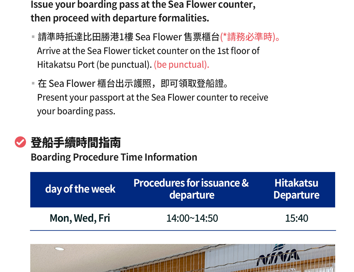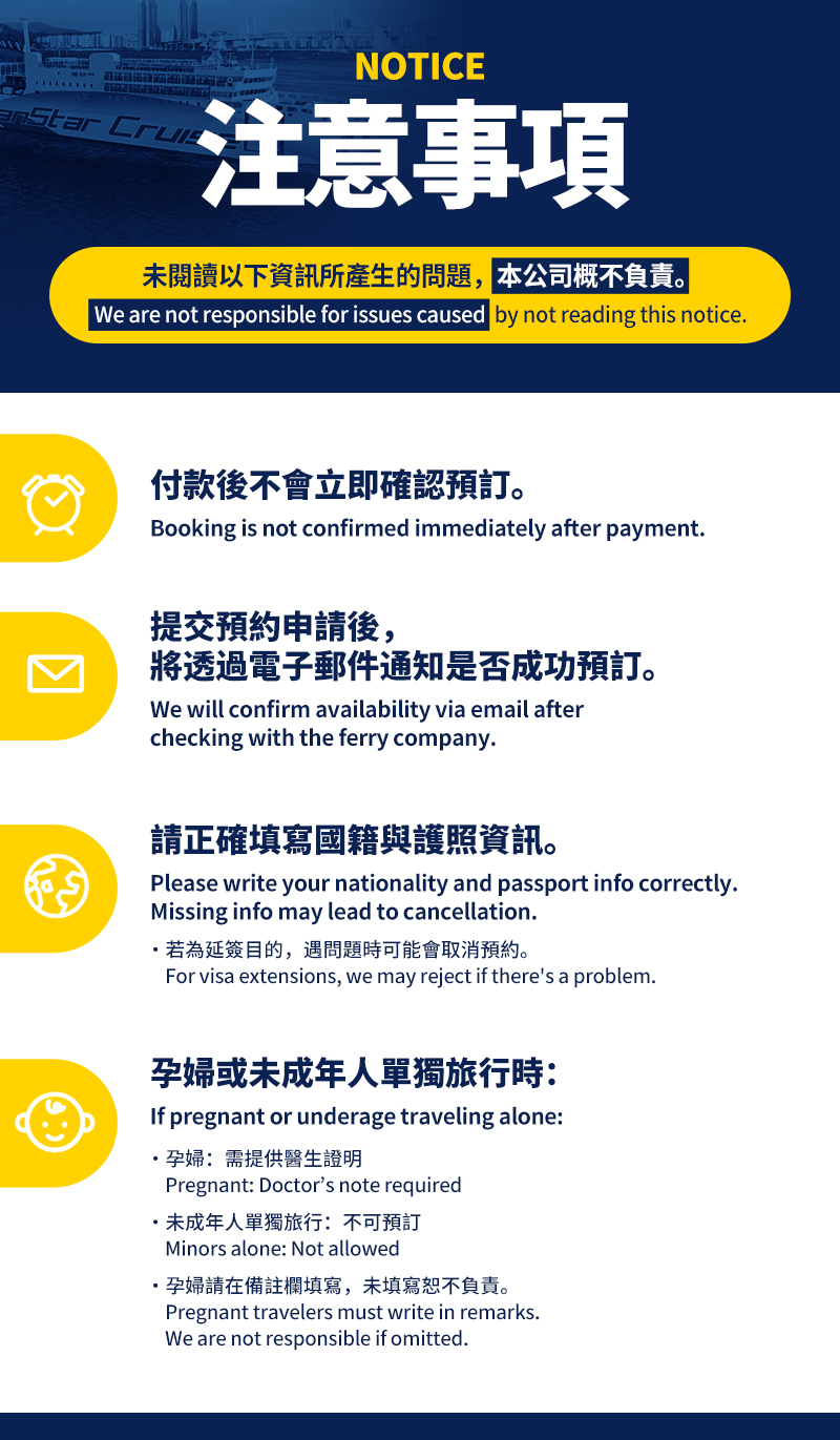 - 詳細登船資訊將在您的預訂確認後透過電子信箱寄送——請仔細查閱。