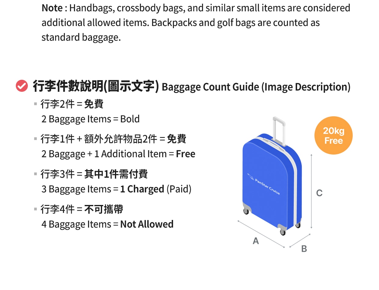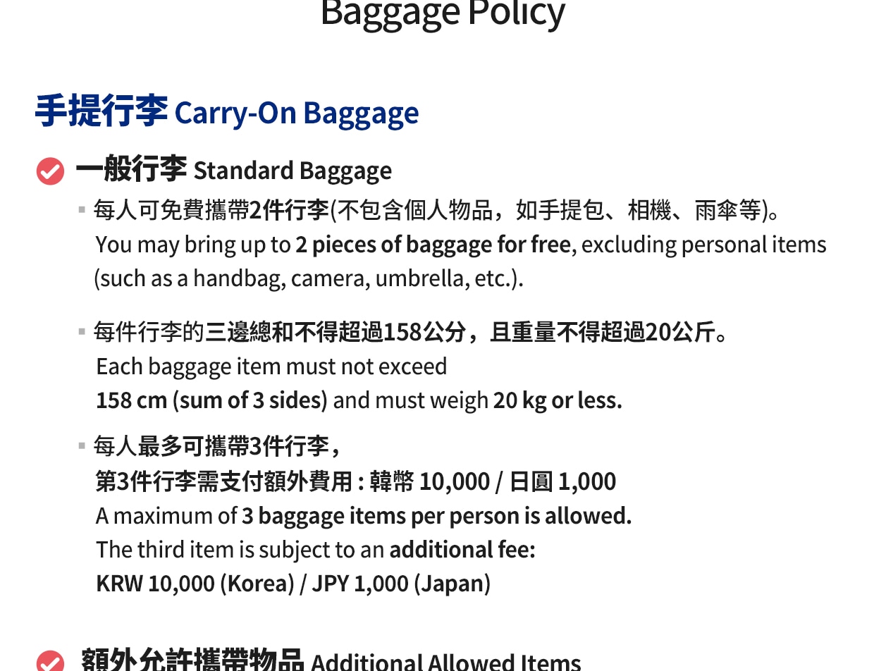 - 每位乘客可攜帶兩件隨身行李(手提箱)。