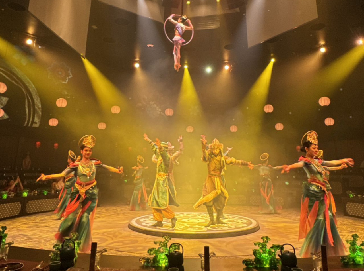 環形大堂搭配360度環形3D大屏與全息投影技術,構建出全包覆式動態場景——時而切換為盛唐宮闕的恢弘壯闊,時而流轉為江南水鄉的溫婉雅緻。硃紅雕欄、輕紗帷幔等古雅陳設,與科技光影碰撞交融,兼顧宮廷美學的厚重與現代設計的靈動。212個餐位錯落分佈,無論身處何處,都能沉浸式融入這場時空幻境,讓視覺與觸感全程在線