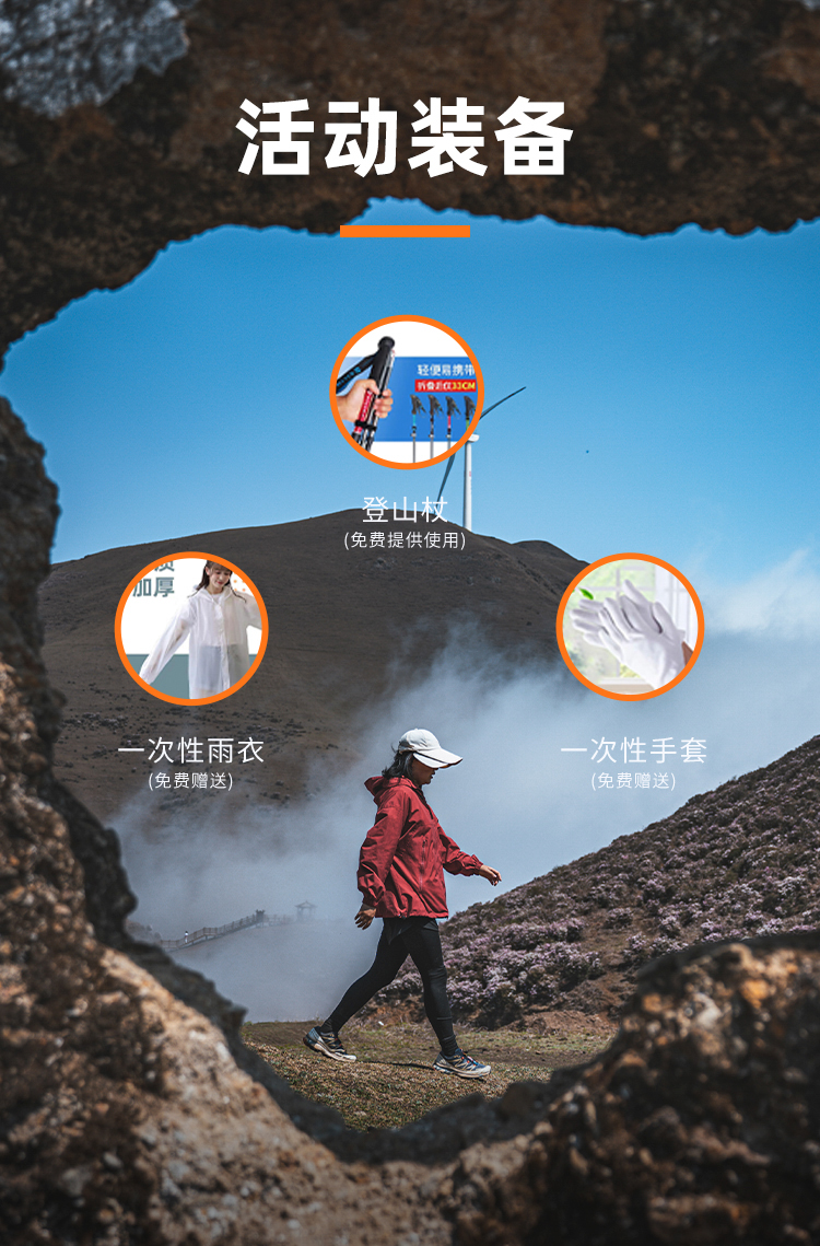 - 提供活動裝備:登山杖、雨衣、手套
