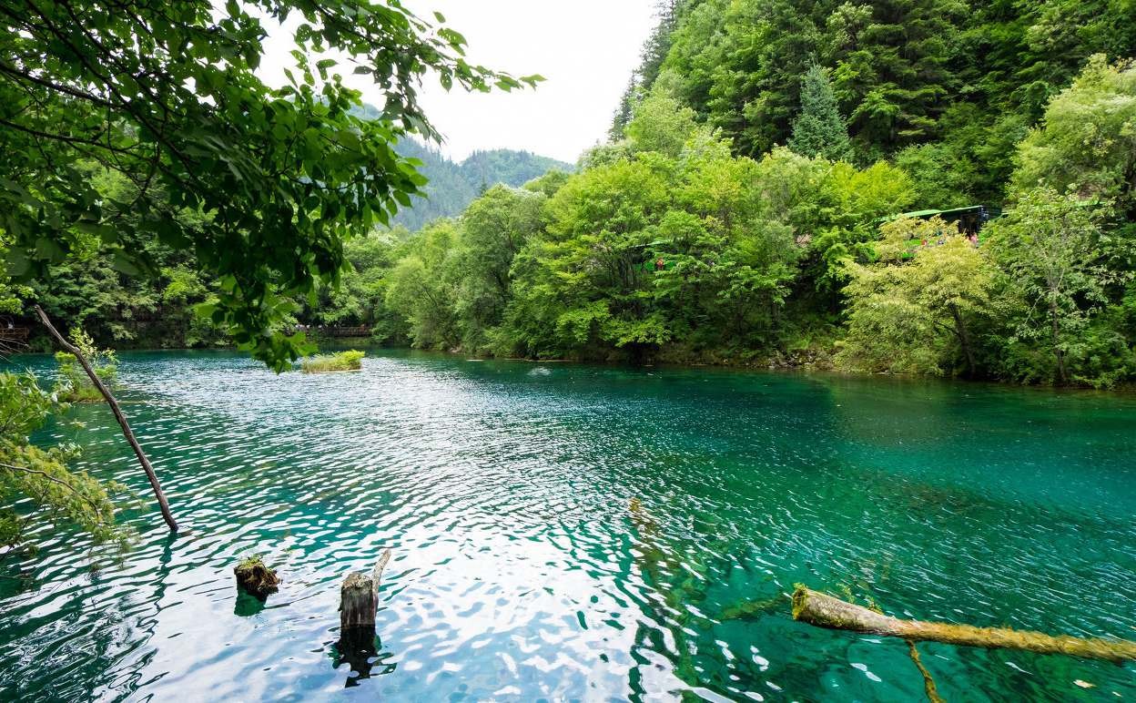 九寨精華中的精華,湖底鈣華+藻類+枯木俯瞰像開屏的孔雀。