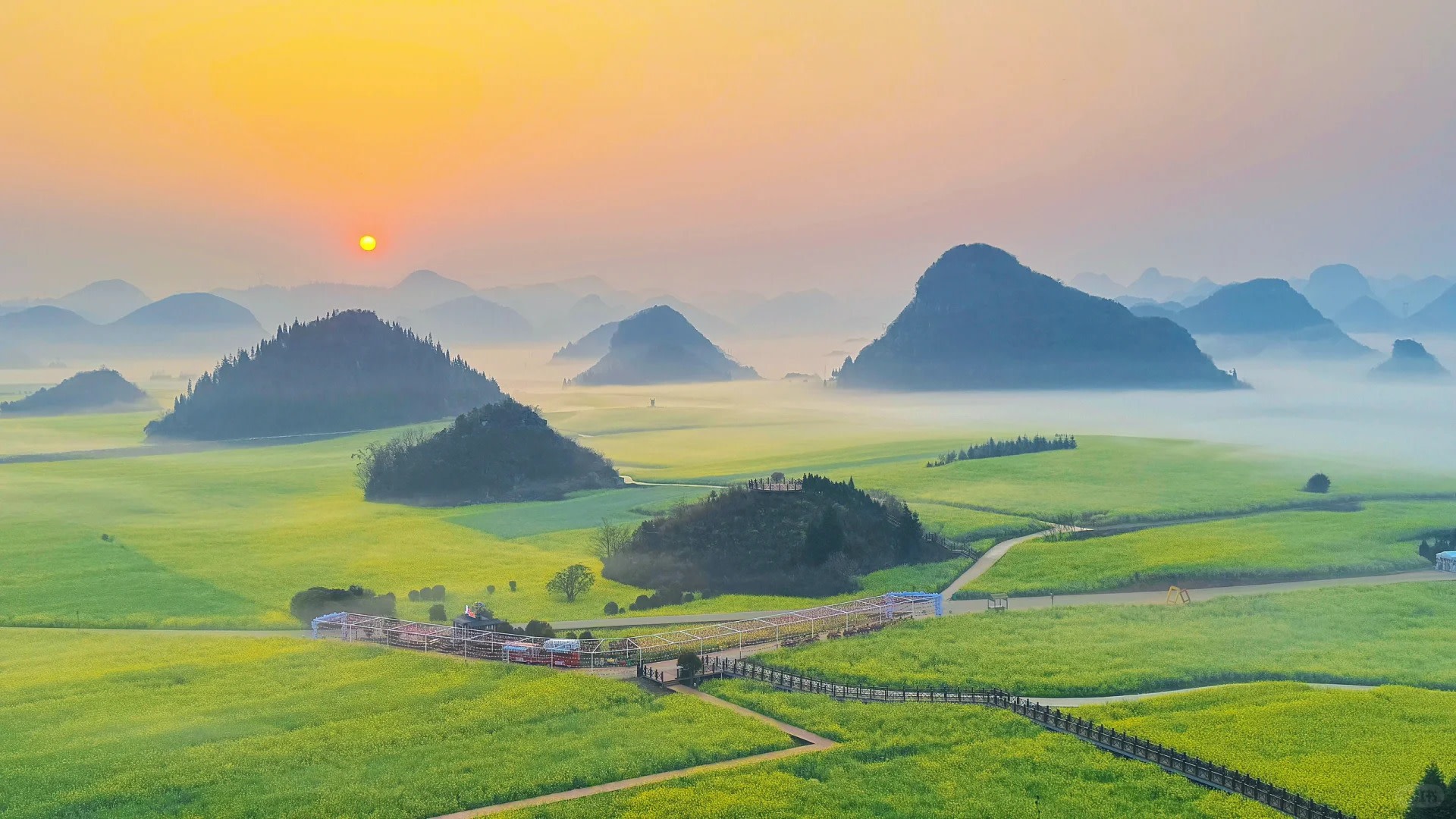 - 壯觀地貌:百萬畝花海鋪陳喀斯特峰林,大地打翻的金色調色盤