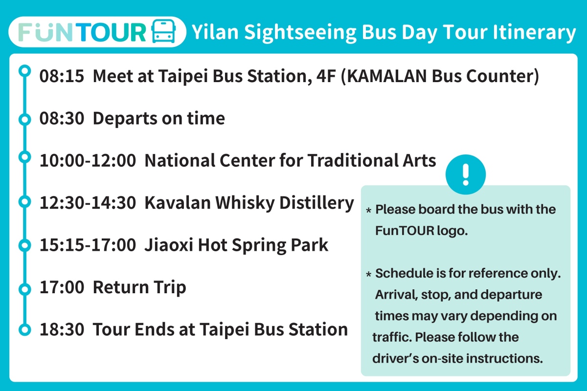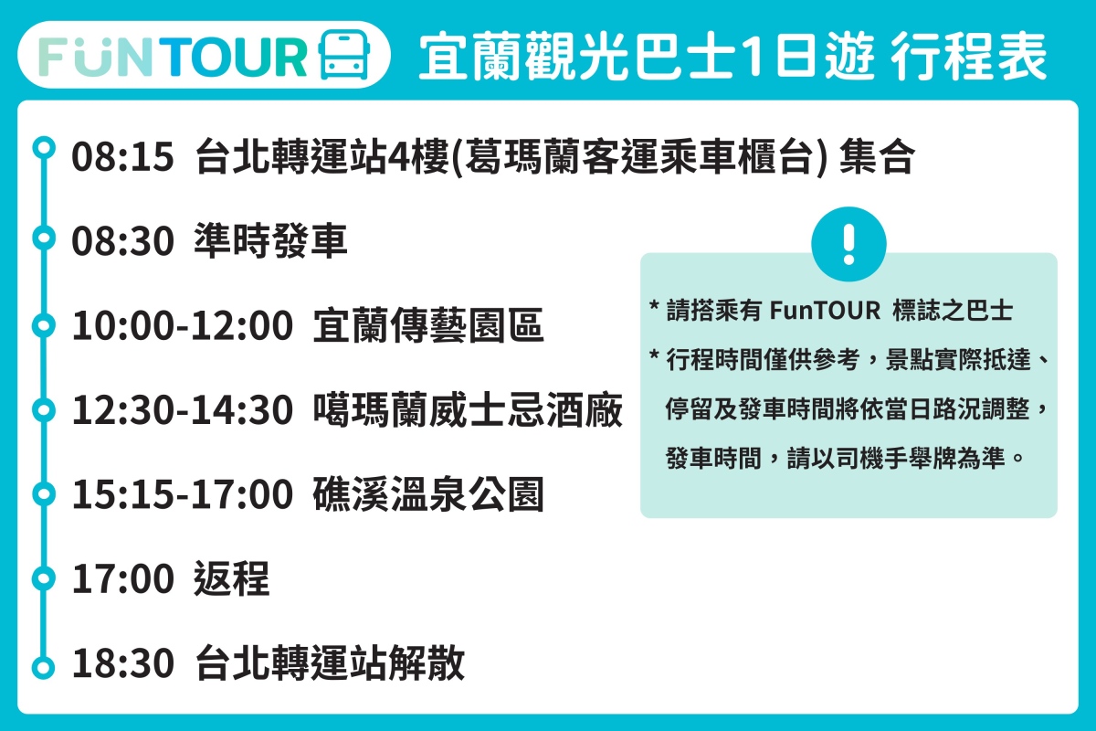 宜蘭 FunTOUR觀光巴士一日遊:傳藝園區&金車噶瑪蘭威士忌酒廠&礁溪溫泉公園(台北出發)(含門票)