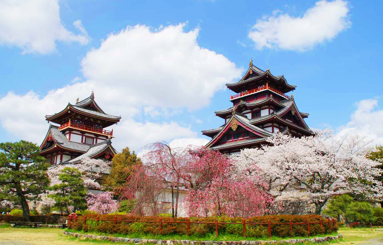 - 伏見桃山城:登高望遠,硃紅天守與漫天櫻雪共譜戰國春色。