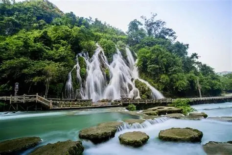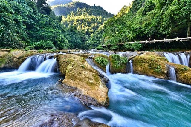 瀑面寬達40米,如銀河墜落,分層跌宕形成階梯式奇觀。水霧輕拂臉頰,清涼舒爽,瀑聲與鳥鳴交織成自然交響樂。