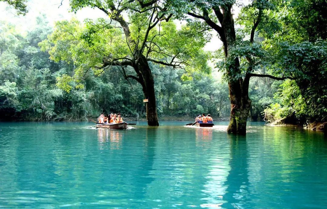 兩湖相連,湖水隨光線變幻出夢幻藍調。遊客可自費划船穿梭於水上森林間,枯木林立,倒影搖曳,宛如置身亞馬遜秘境。🚣♂