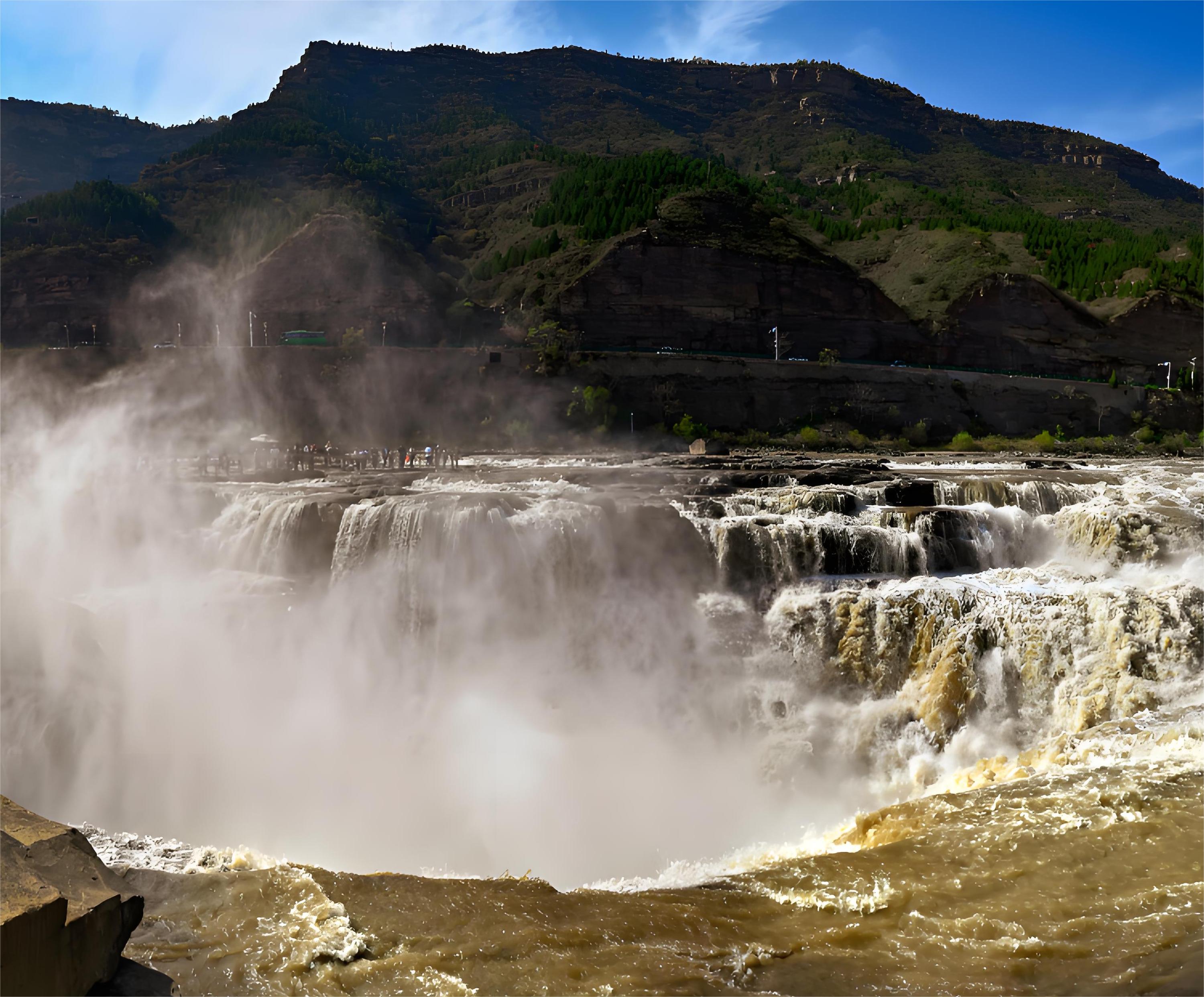 瀑布以排山倒海之勢、雷霆萬鈞之力,讓黃河之水在晉陝峽谷間如巨龍咆哮著傾瀉而下,激起漫天水霧,盡顯磅礴壯闊。