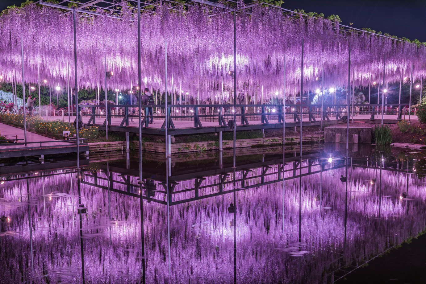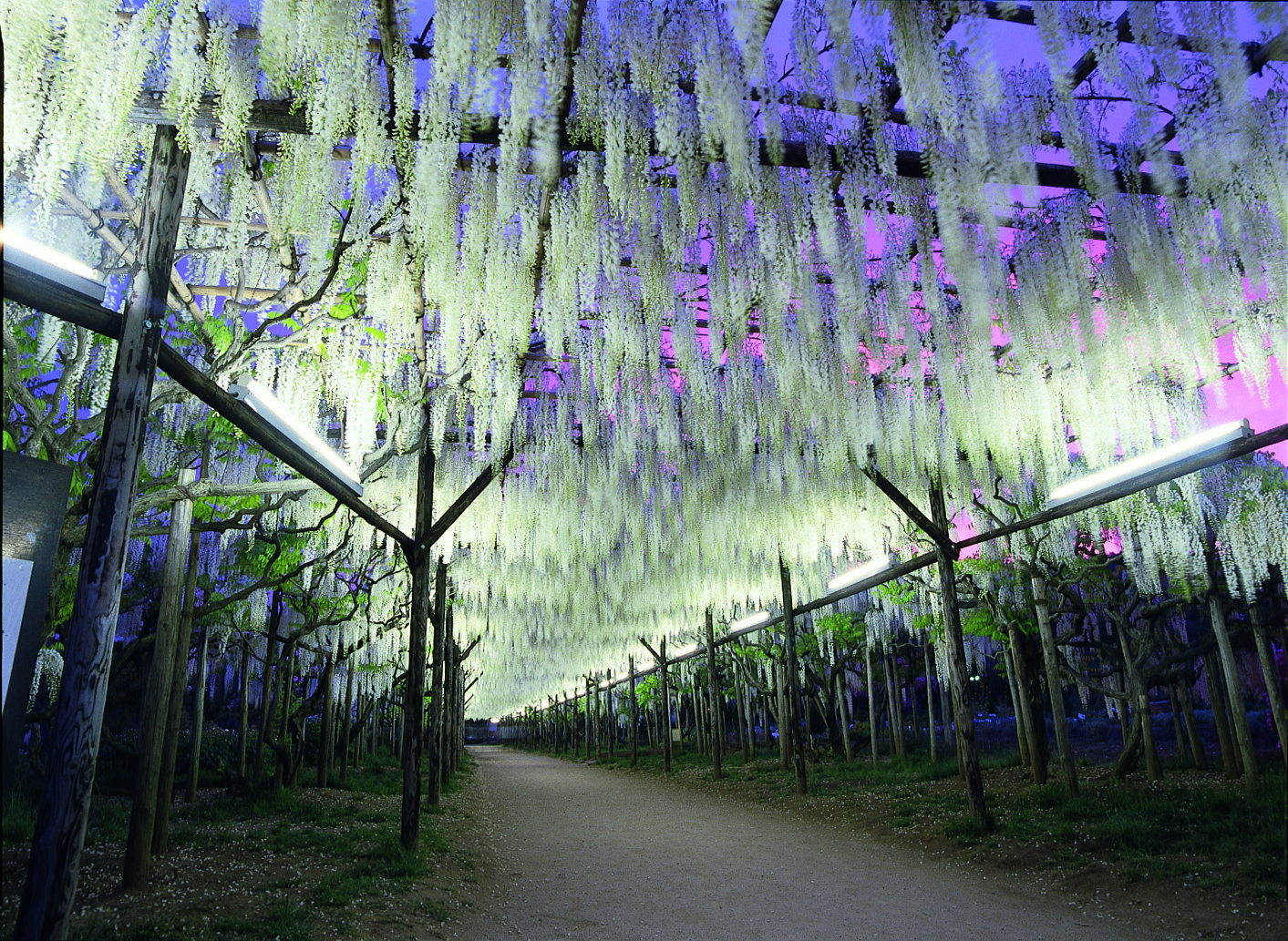 - 在足利花卉公園每年春季舉辦的紫藤花觀賞活動「藤之花物語」,特別推薦在 傍晚至夜晚的燈光點亮時段前往欣賞。其中最壯觀的是 佔地約1000平方公尺的大紫藤棚(樹齡約150年,並被栃木縣指定為天然紀念物),以及 長達80公尺的黃花紫藤隧道,都是不可錯過的亮點。此外,園內還有 白藤、淡紅藤 以及 超過5000株杜鵑花 等各式花卉繽紛綻放,色彩斑斕。