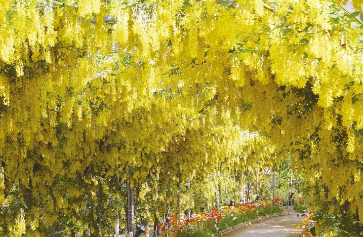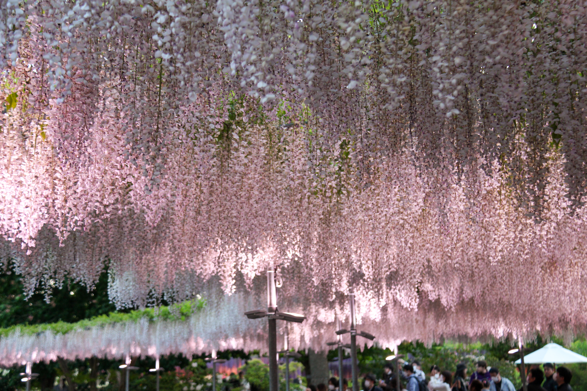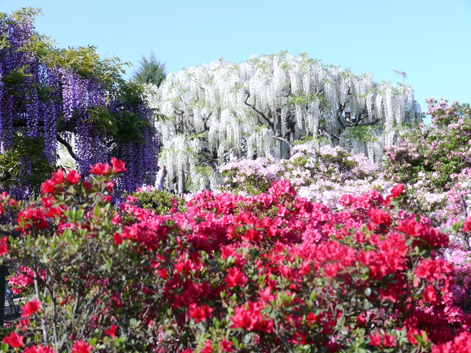 - 前往被稱為「世界最美」的大藤棚,佔地約 1,000平方公尺 的巨大藤棚被譽為 「世界最美的紫藤」。可以欣賞到 樹齡約160年的三面大藤棚、珍稀的重瓣大藤棚,以及 長達80公尺的白藤隧道 和 黃花藤等景觀。