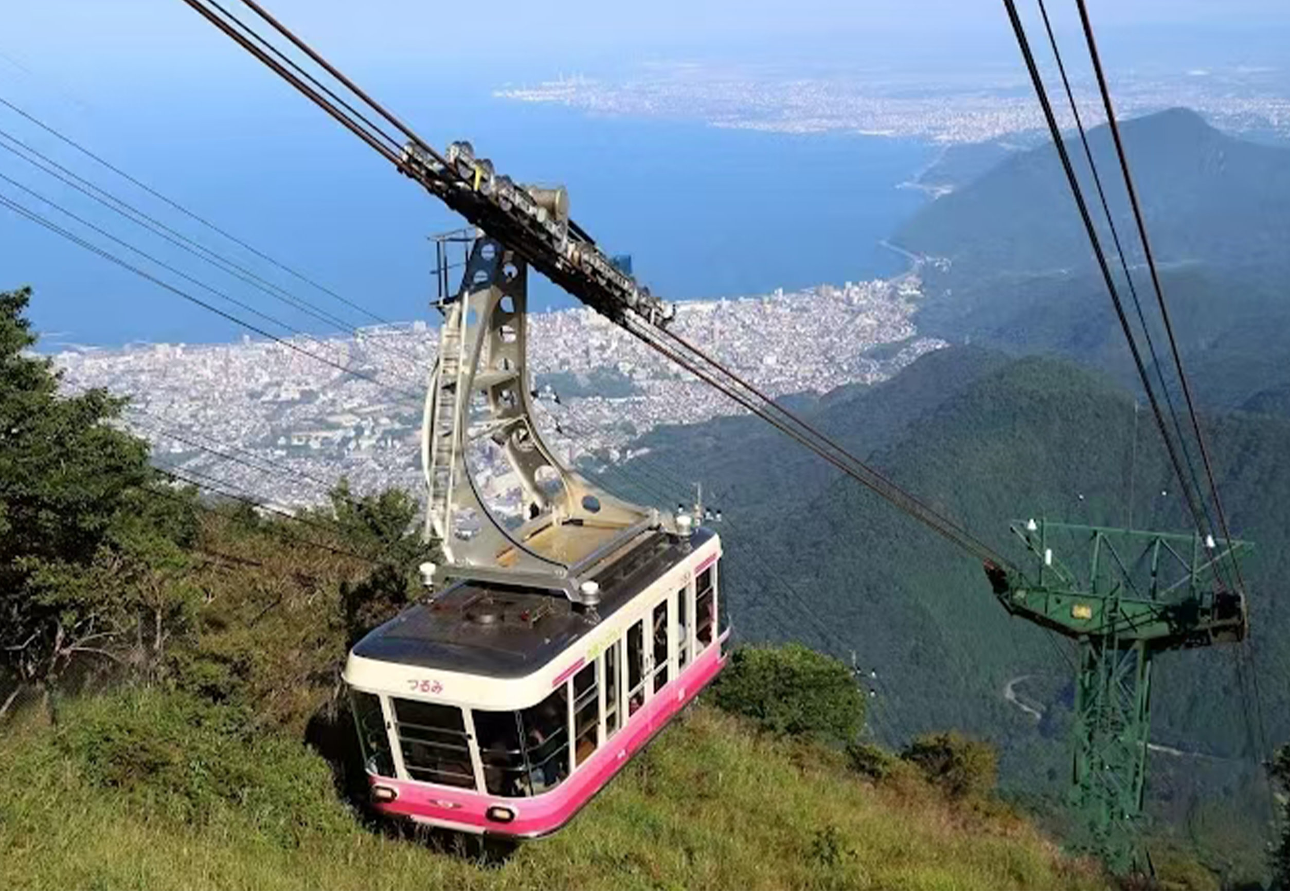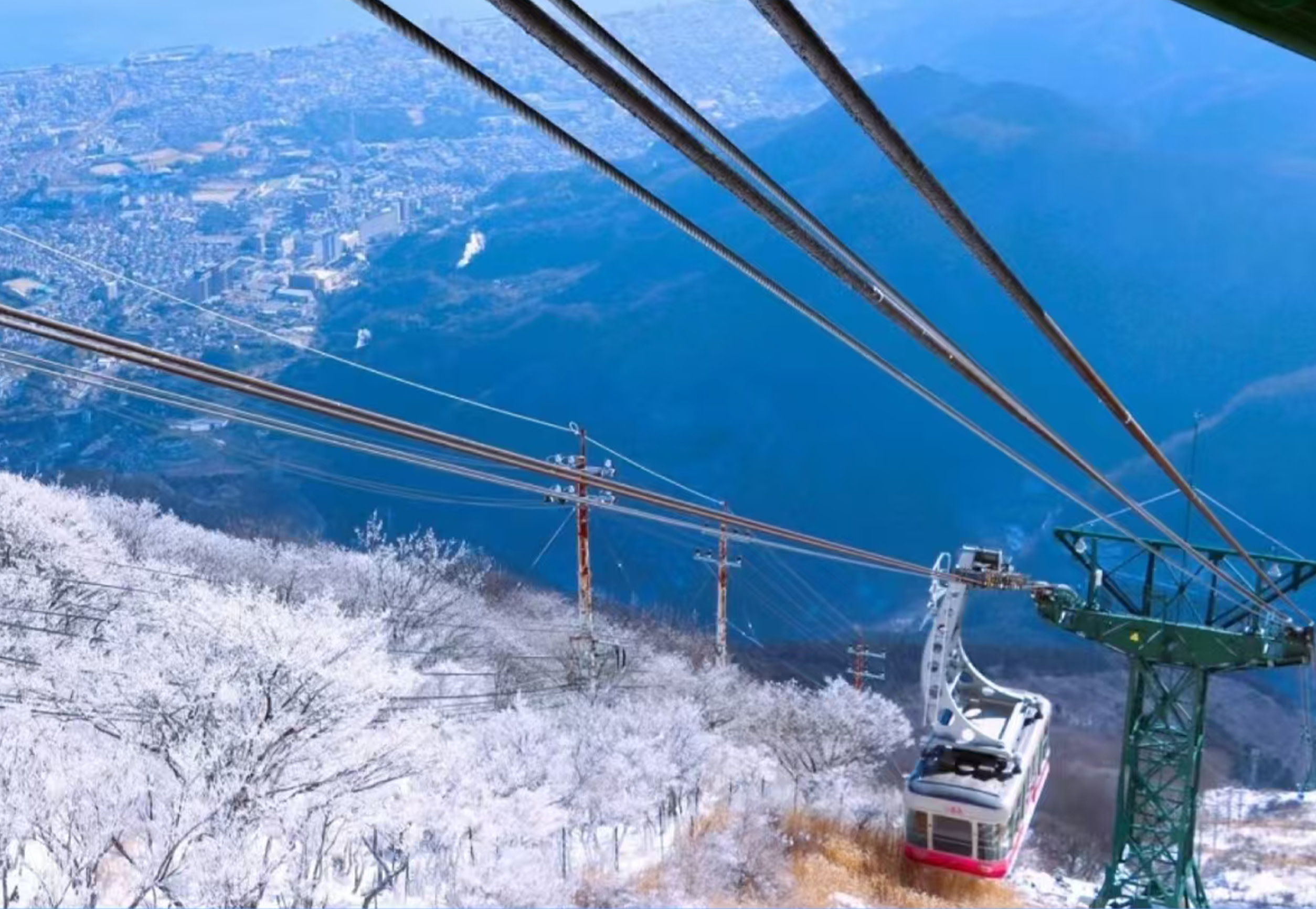 又稱由布院,九州頂尖溫泉藝術小鎮,坐落於由布嶽下盆地。溫泉泉質優良、泉湧量居日本前列,湯之坪街道文藝清新,金鱗湖秋冬晨霧繚繞,波光粼粼如撒金。乘坐“由布院之森”觀光列車而來,宛如闖入動畫治癒世界。 - 別府纜車|雲端俯瞰九州全景