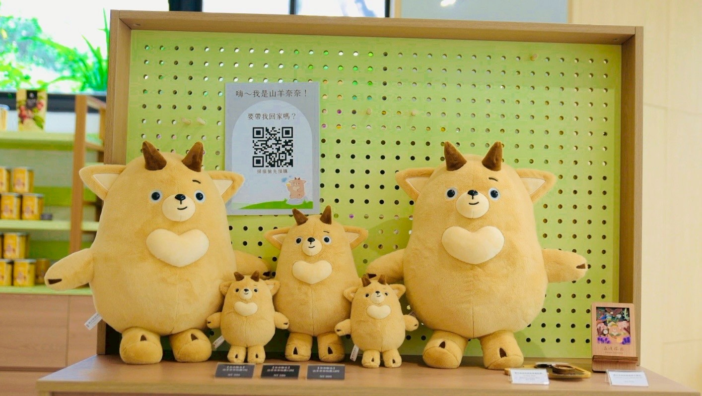 二樓集結南投在地30間在地茶飲、點心、伴手禮商品,推廣南投在地物產,一樓則為山羊奈奈IP商品,讓旅客能把園區體驗延伸帶回家。