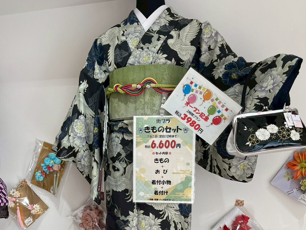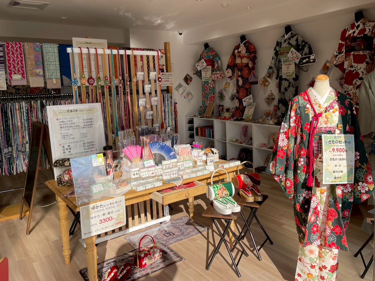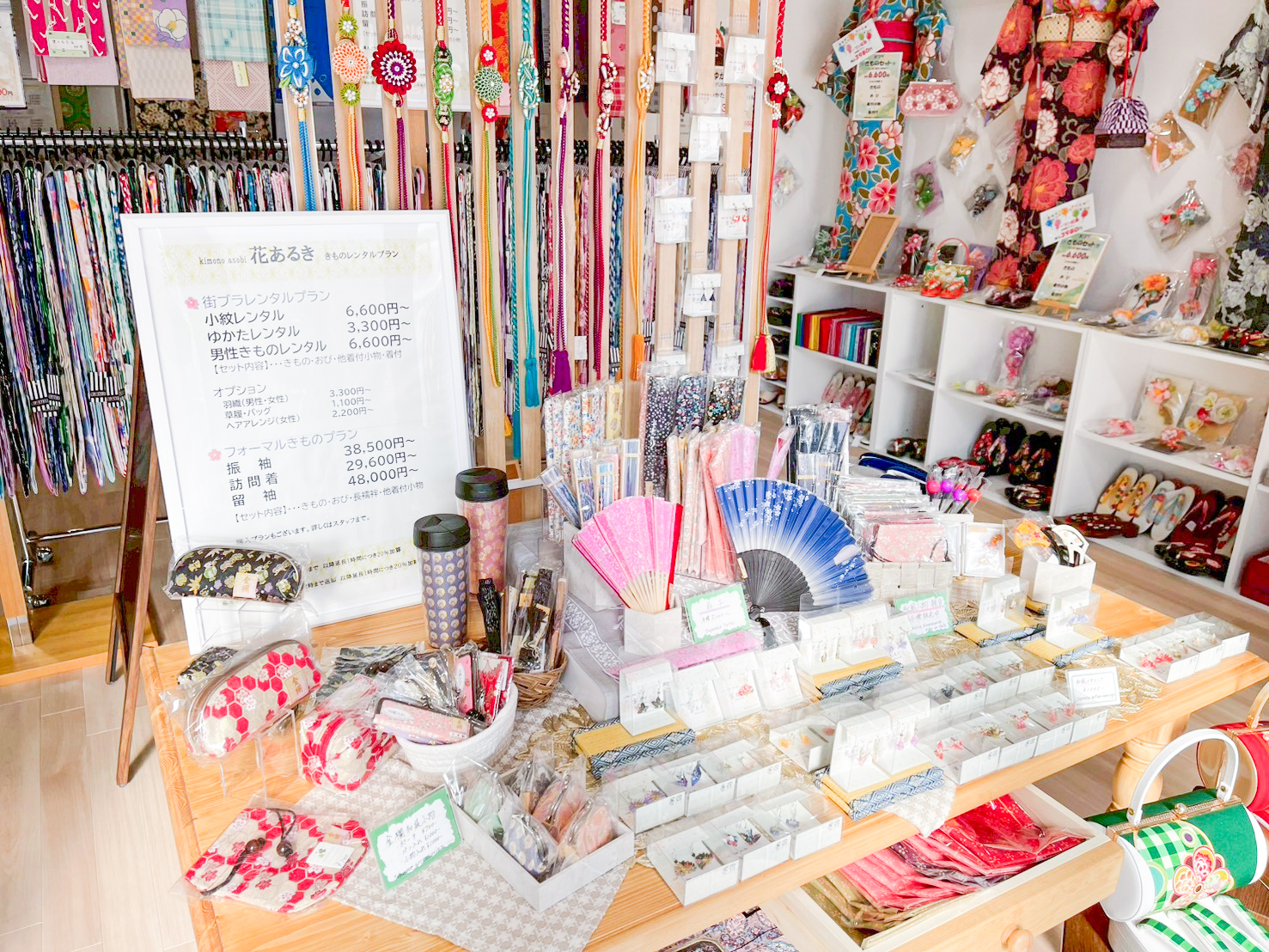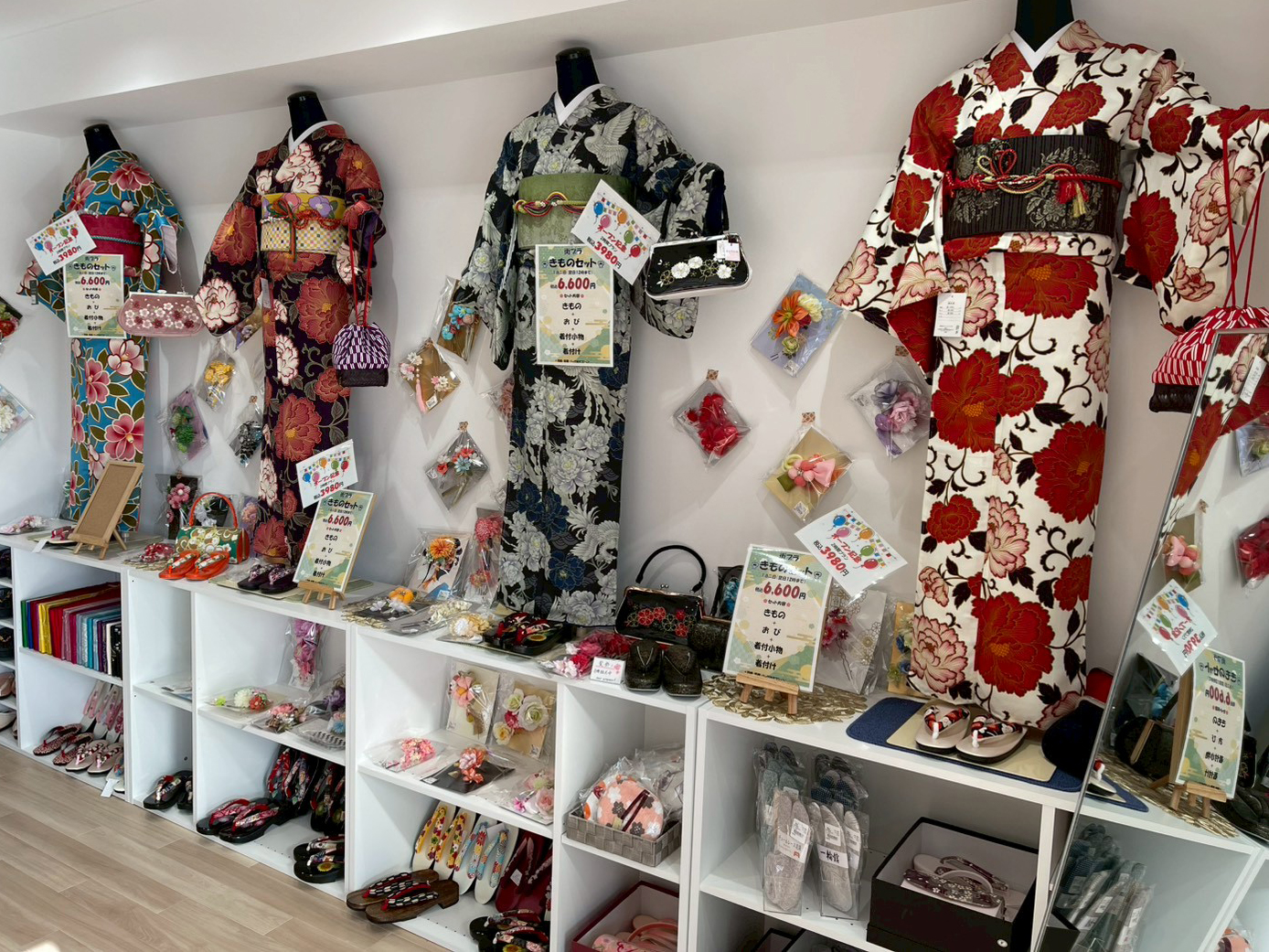 提供多種和服選擇,從休閒款式到正式禮服應有盡有,還有各式配件如草履、髮飾和手提包。