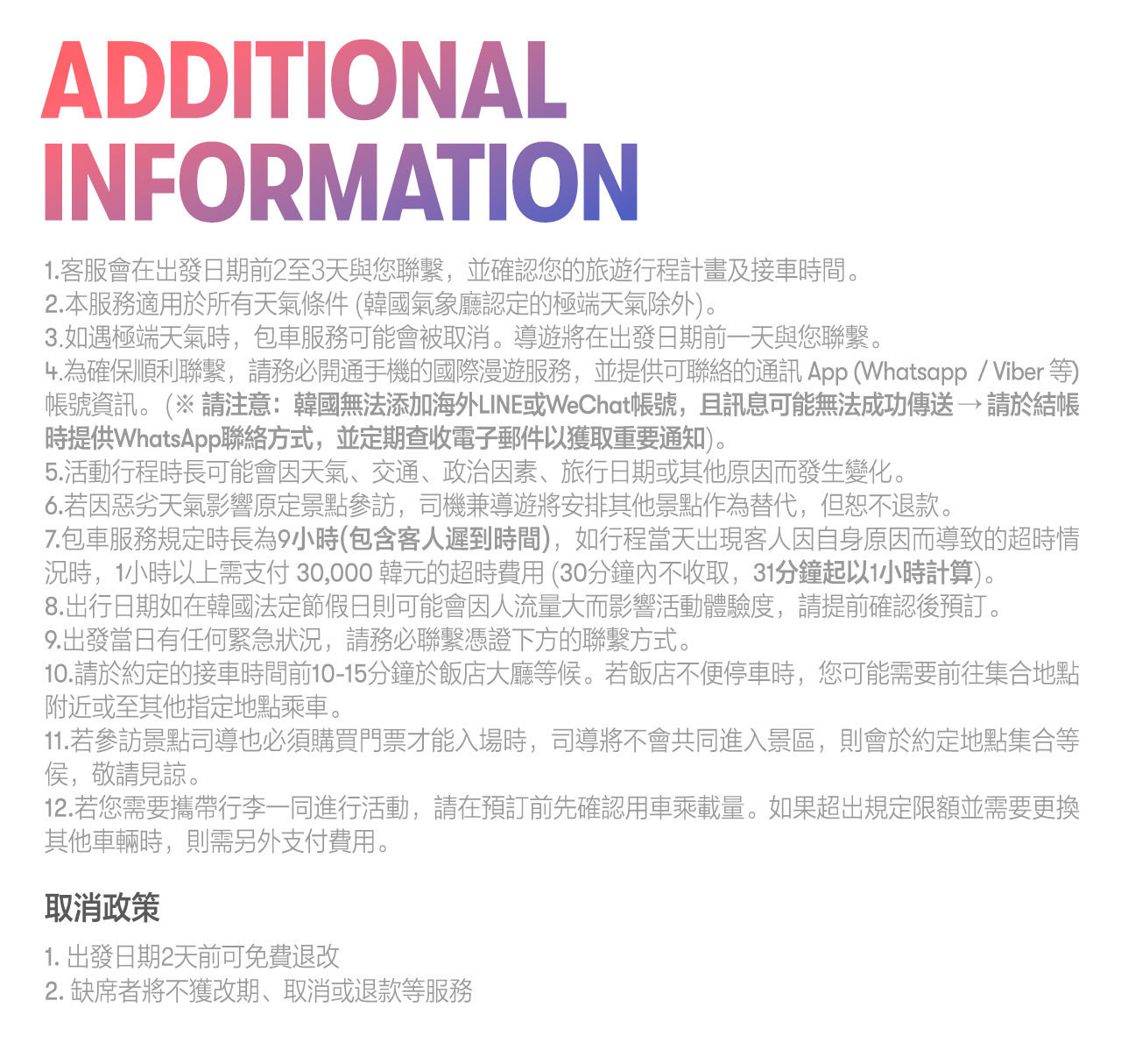 - 此服務涵蓋9小時。 遲到超過1小時,將收取30,000韓元超時費。遲到30分鐘以內不收取額外費用。超過31分鐘則算作超時1小時。