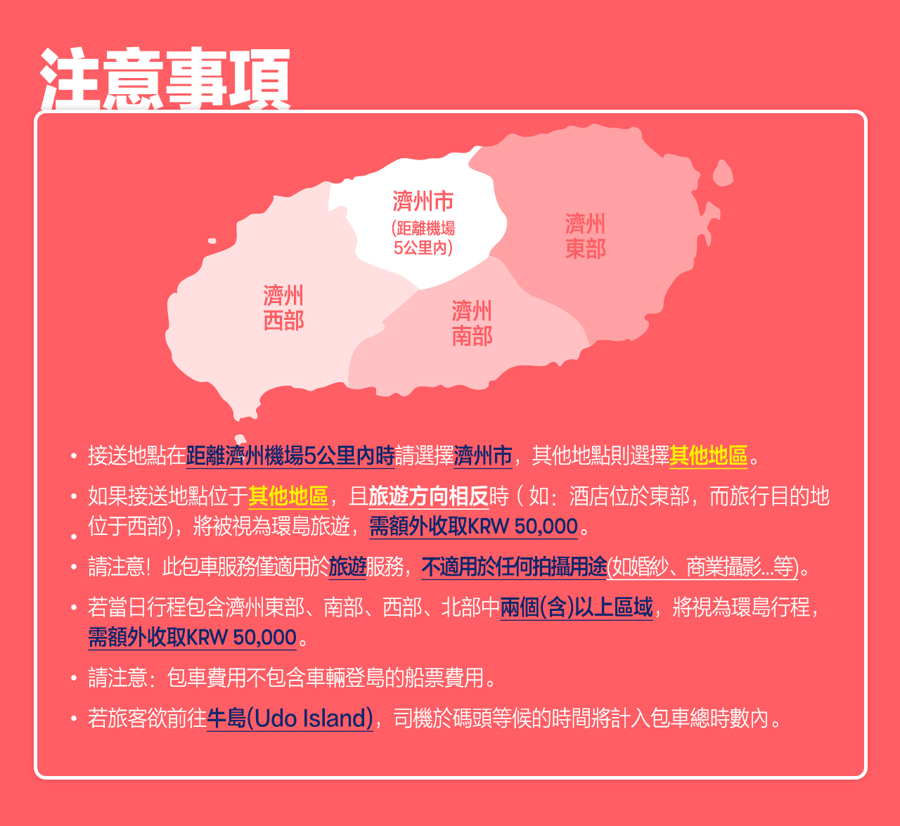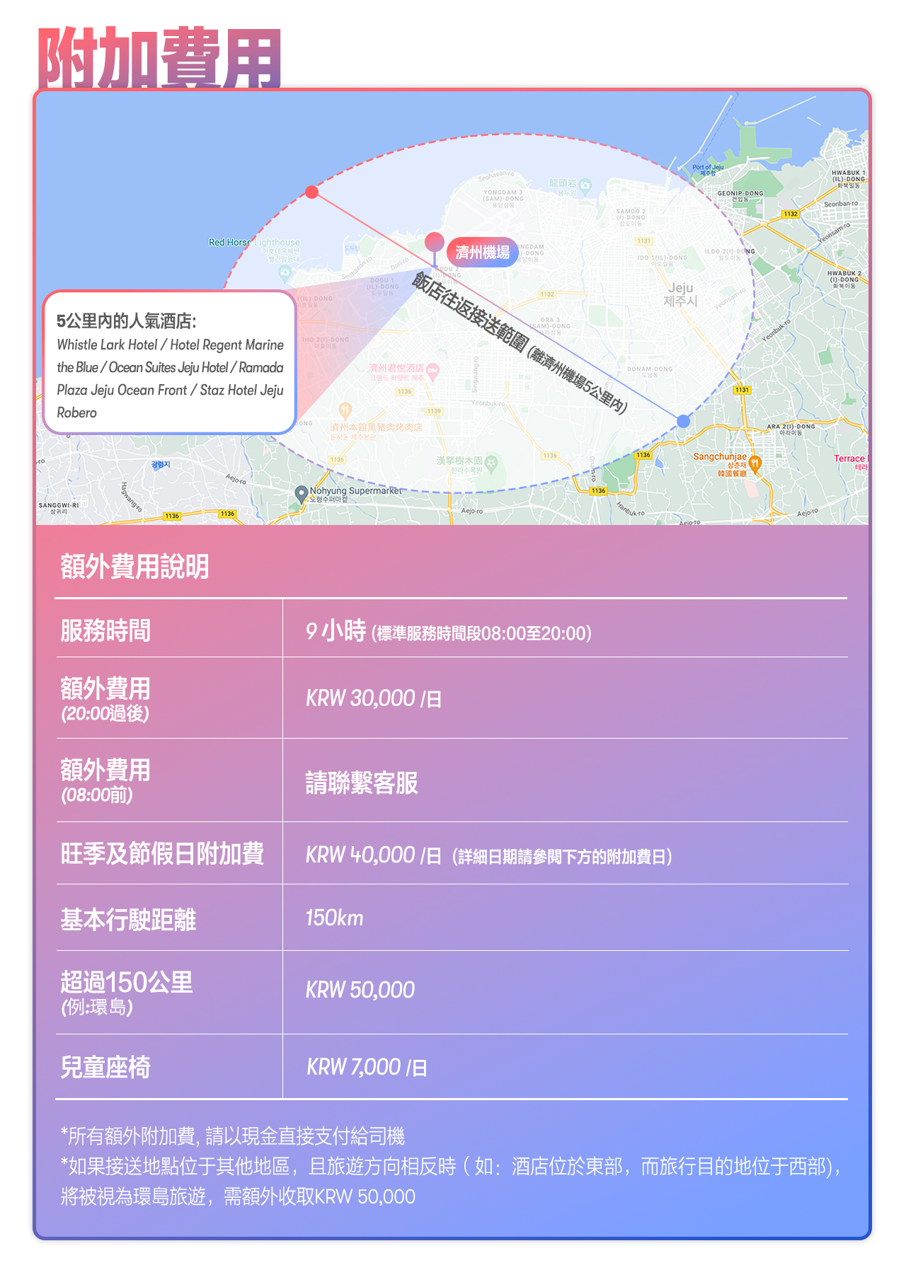 本活動包含哪些路線?是否可以定製路線? 由於這是一項私家車租賃服務,行程完全由你定製。你可以選擇濟州島上你想要參觀的景點和目的地,確保個性化和靈活的旅行體驗。我們的司機將在你的旅行日期前2天與你聯繫,討論你的行程。 # 在每個景點停留多長時間? 在每個景點停留的時間可以根據你的需要調整。一般來說,司機會與你討論,確保有足夠的時間參觀和拍照。請注意,本活動不包含門票,需要單獨購買 詳細包含內容,請參考套餐詳情 # 費用包含哪些項目,哪些項目需要額外付費? 本活動包含9小時私家車租賃服務、停車費、燃油費和過路費。額外費用可能包括景點門票、兒童座椅、額外加班、節日附加費和超出公里數費用。請參考套餐詳情瞭解費用詳情。 # 預訂確認後,運營商何時提供司機和車牌信息? 司機將在行程日期前2 - 3天通過你提供的聯繫方式(WhatsApp / 微信 / LINE / Viber / Kakaotalk)與你聯繫,討論行程並確認接載詳情。 請確保您可以在預訂時提供的聯繫方式(國際漫遊、公共Line ID或更方便溝通的WhatsApp)聯繫到您 # 我可以在哪裡上下車? 您可以選擇濟州島內的上下車地點。請注意,選擇出發地點時,如果距離濟州機場5公里以內,請選擇“濟州機場5公里以內”。對於其他接載地點,請選擇“濟州機場5公里以外”。請查看下圖以供參考: