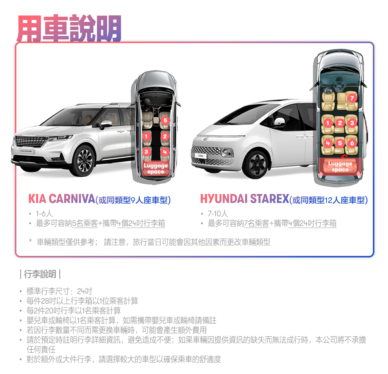 - 預訂前請參考車輛最大行李容量。如果行李數量需要更換車輛,將收取額外費用。