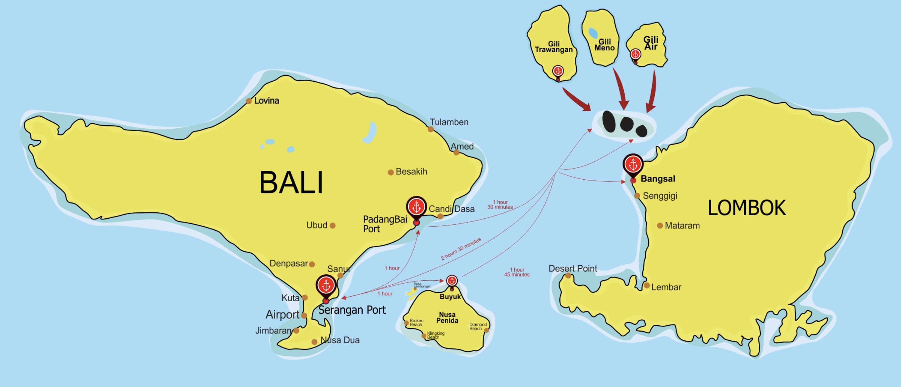 - 從吉利島出發:吉利群島的吉利特拉旺岸島(11:10)– 吉利艾爾島(11:35)– 龍目島(邦薩爾)(12:00)– 八丹拜(13:40)– Serangan(14:55)