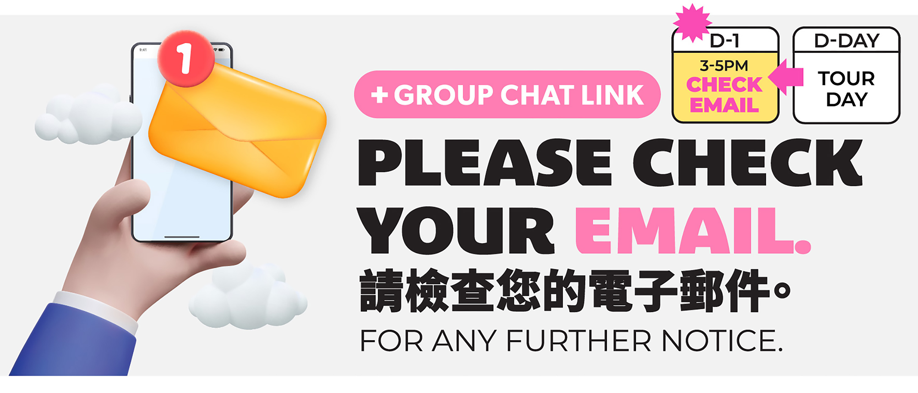 - 出發前一天,我們將在下午3:00至下午5:00之間向您發送一封提醒電子信箱。此電子信箱將包含一個群聊連結,您可以通過該連結直接與我們的旅行工作人員溝通。如果您找不到該電子信箱,請檢查您的垃圾郵件或垃圾箱部分。