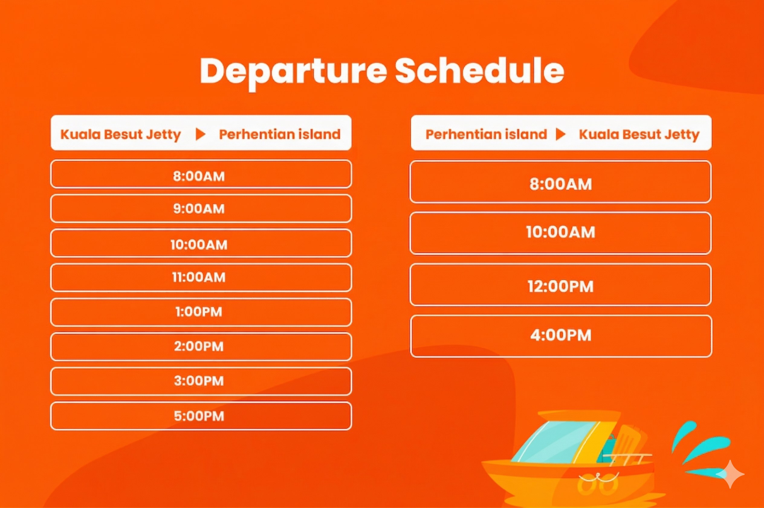 - 08:00:從瓜拉勿述 (Kuala Besut) 出發前往停泊島 (Perhentian)