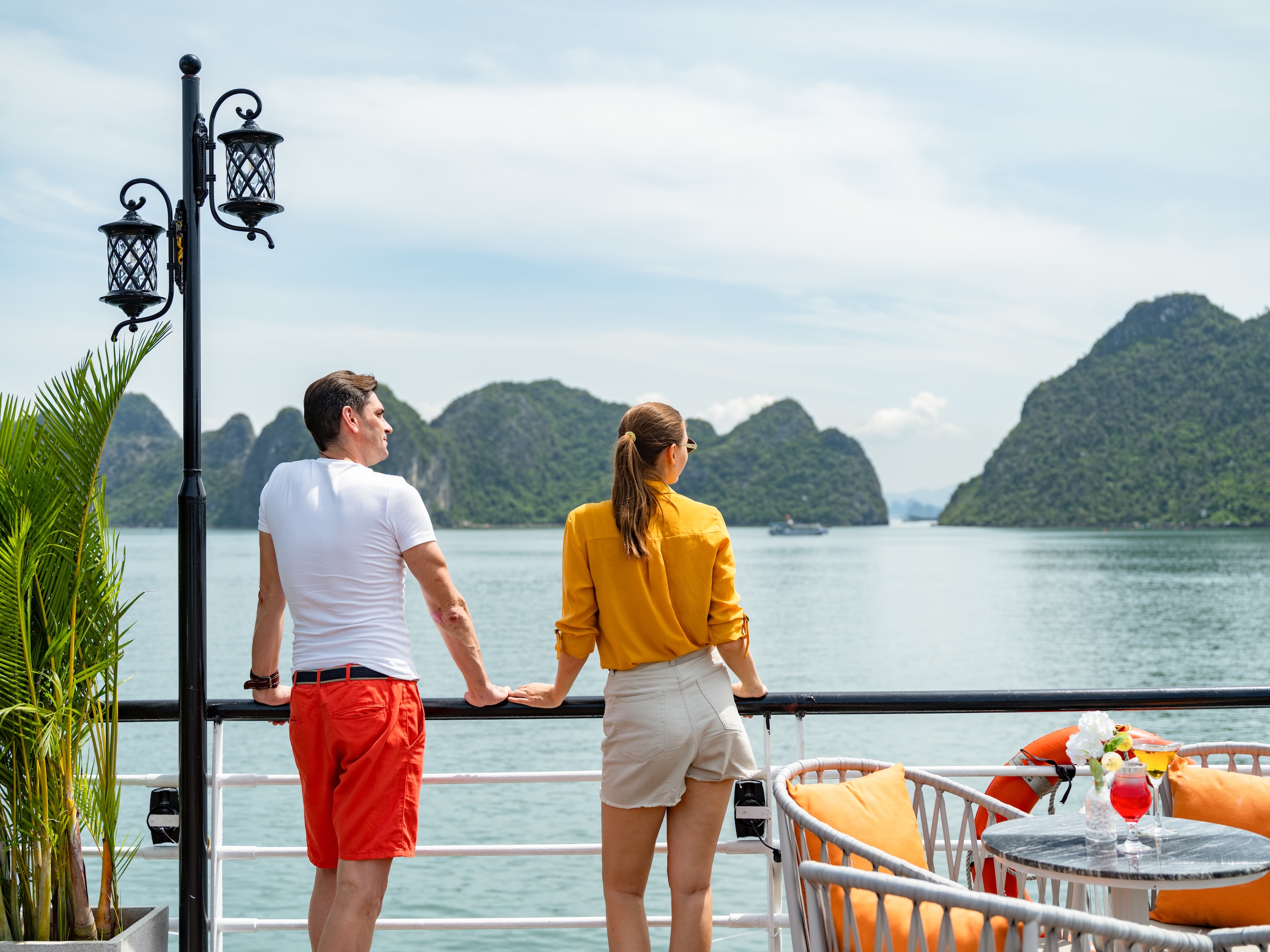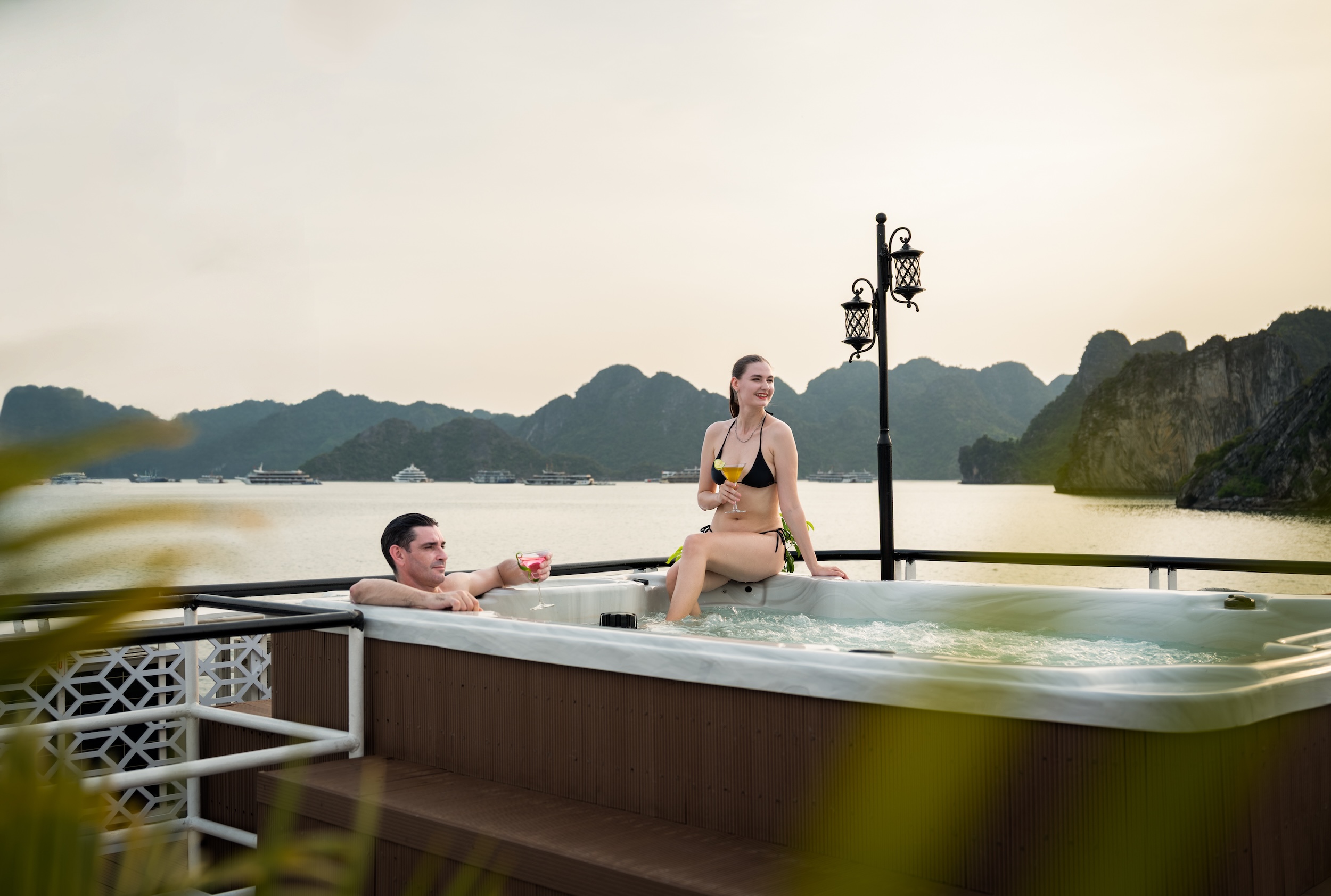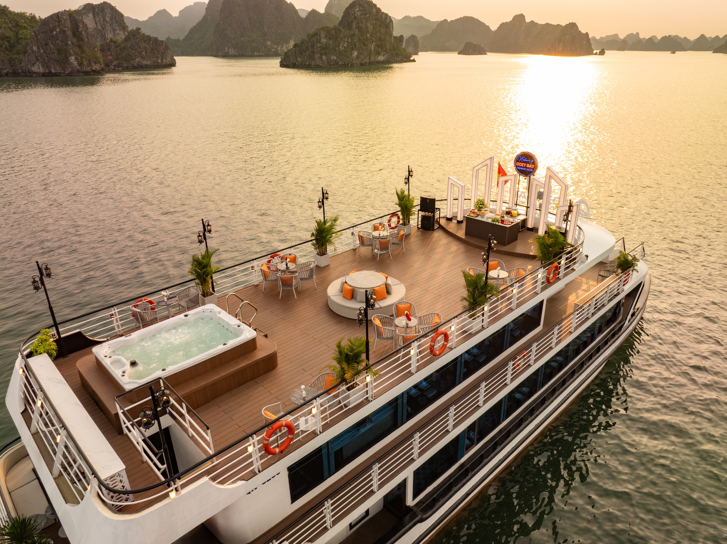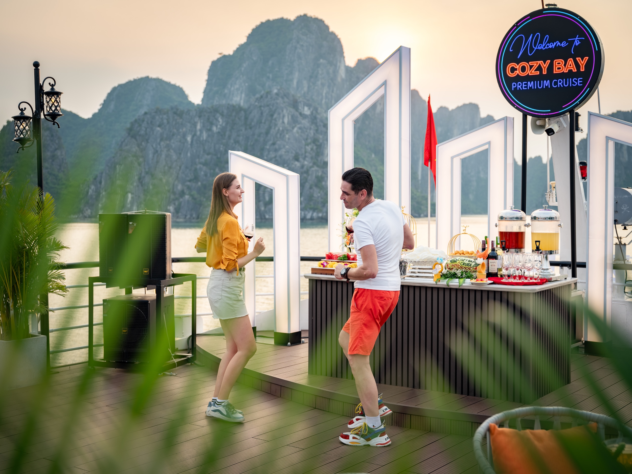 登上全新推出的Cozy Bay尊享郵輪,這艘五星級郵輪在下龍灣重新定義了優雅。這艘三層郵輪擁有時尚的印度支那設計,設有兩間雅緻的餐廳和一個寬敞的陽光甲板——是欣賞壯麗景色的理想場所。