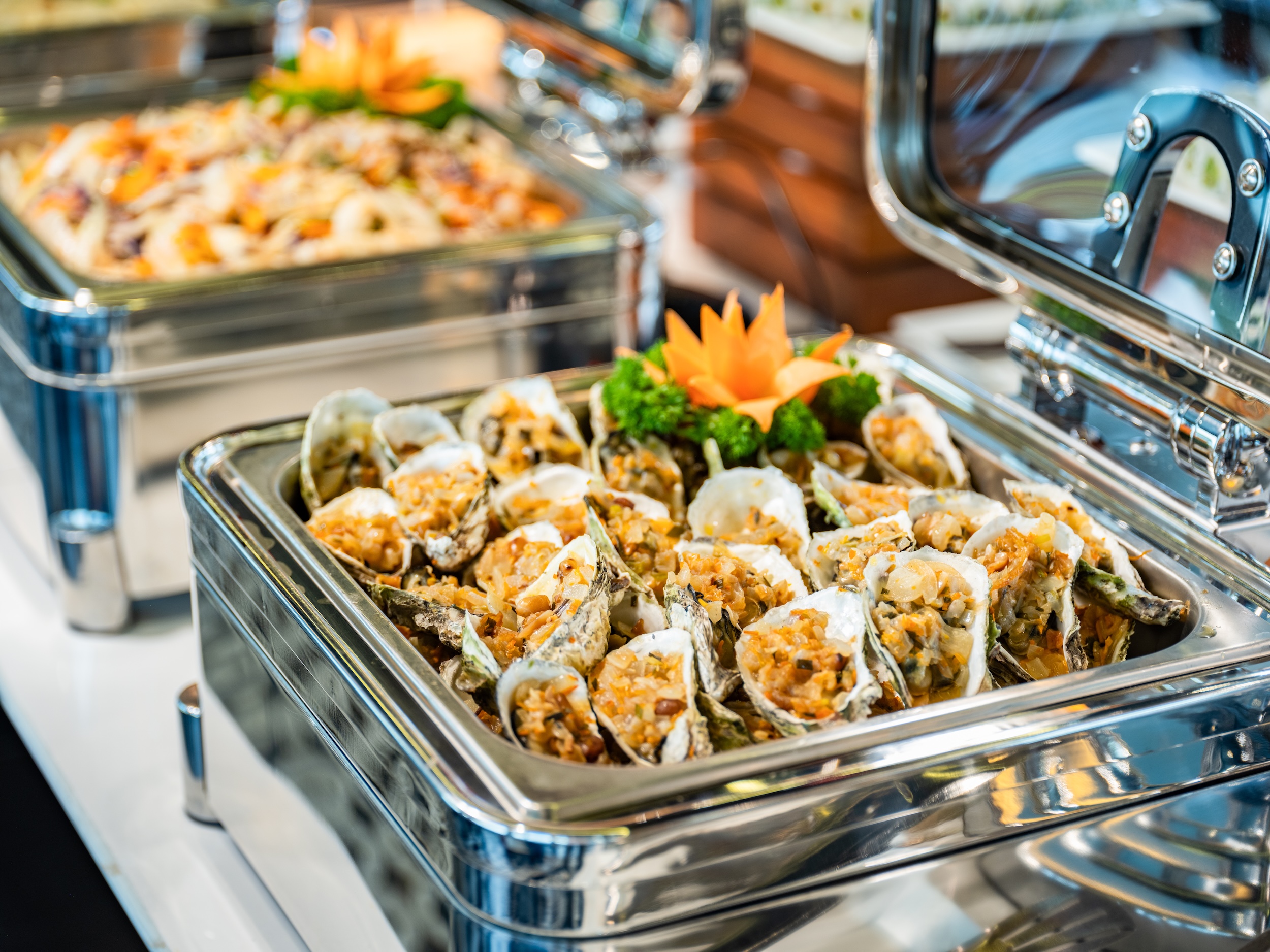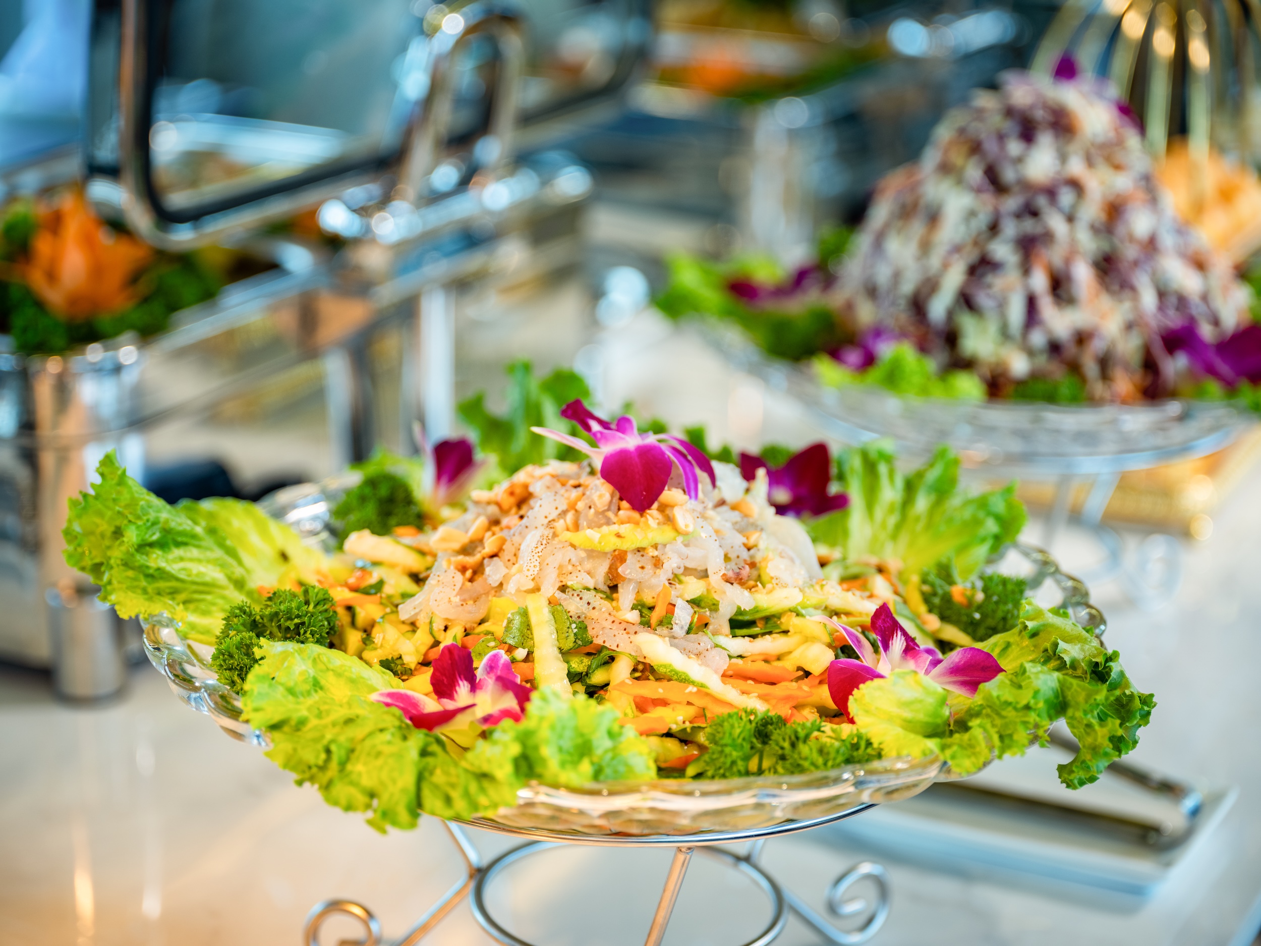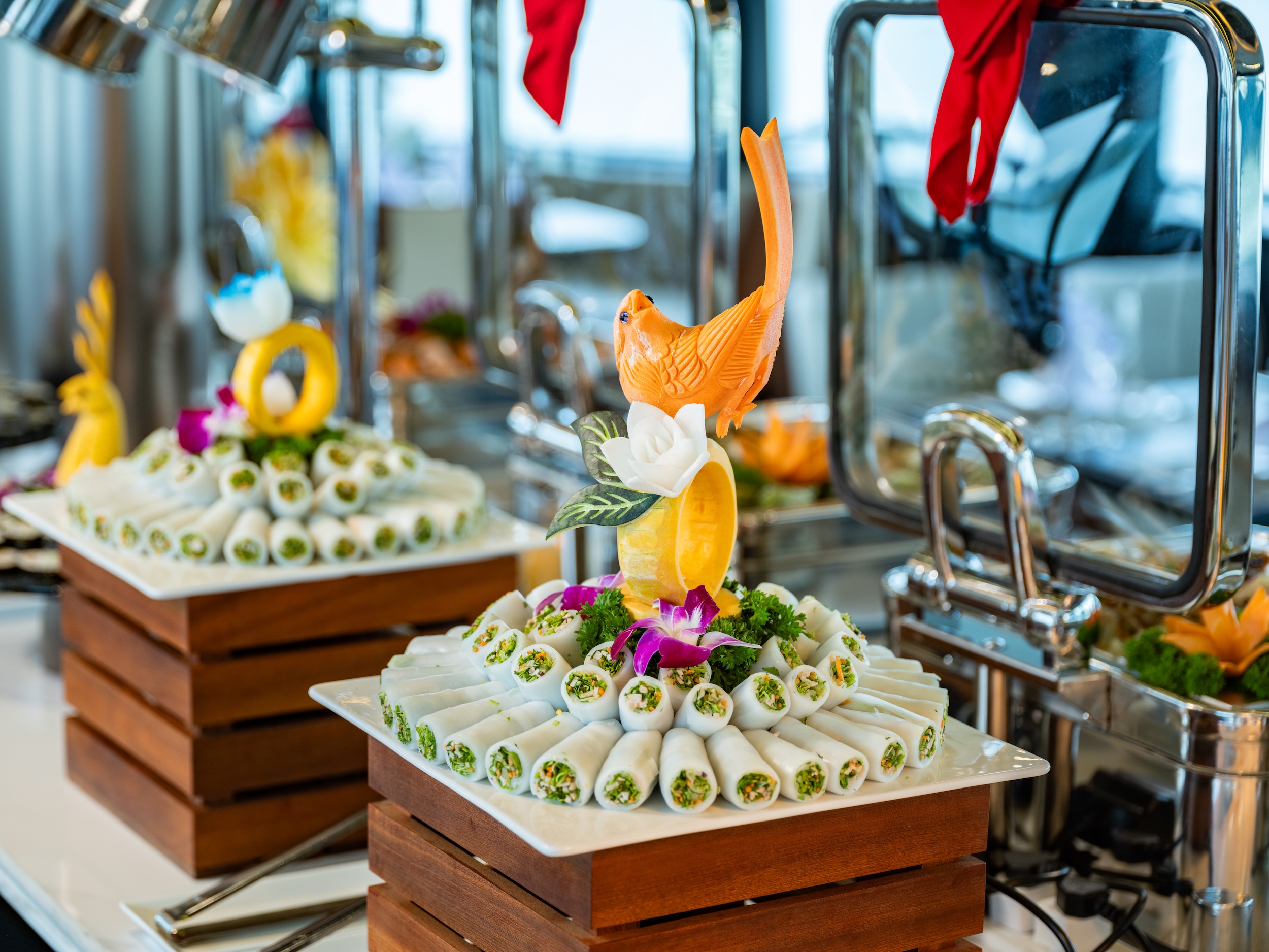 在Cozy Bay Premium Cruise上享用美味的自助餐——每頓餐點都伴隨著下龍灣的迷人景色。