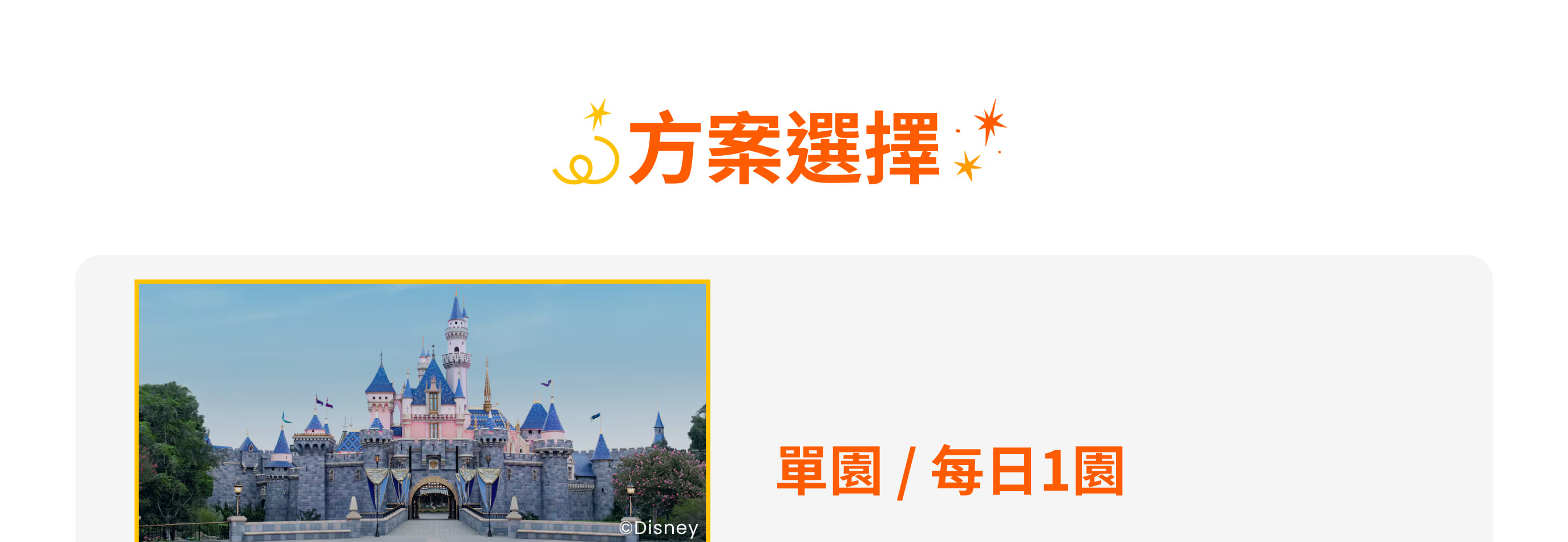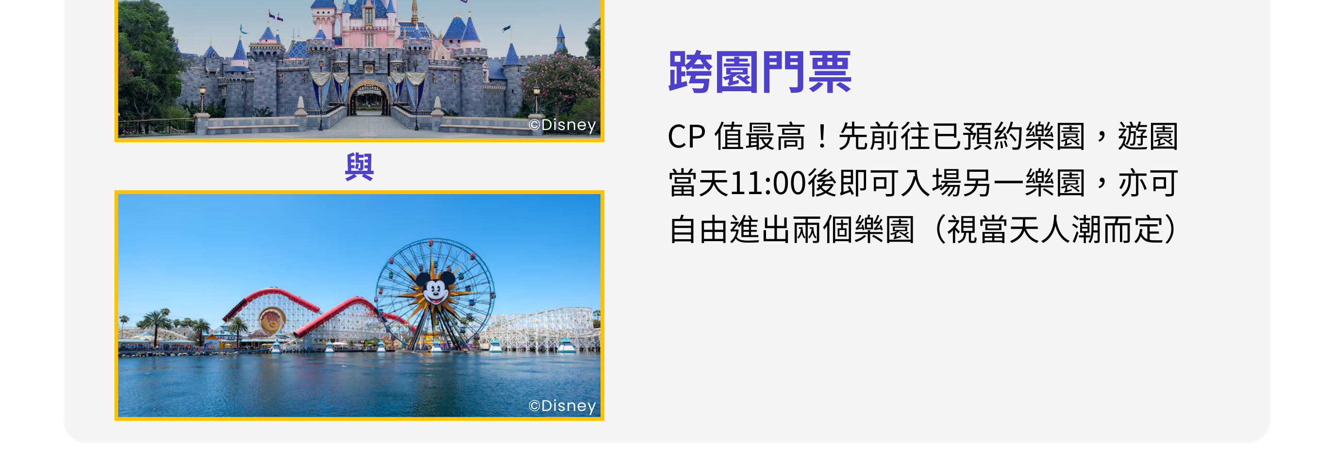 - 分開獨立售票:迪士尼樂園與迪士尼加州冒險樂園分開獨立售票,如欲一次體驗兩座樂園,請購買跨園門票,或於不同日期使用每日1園(多日)門票入場