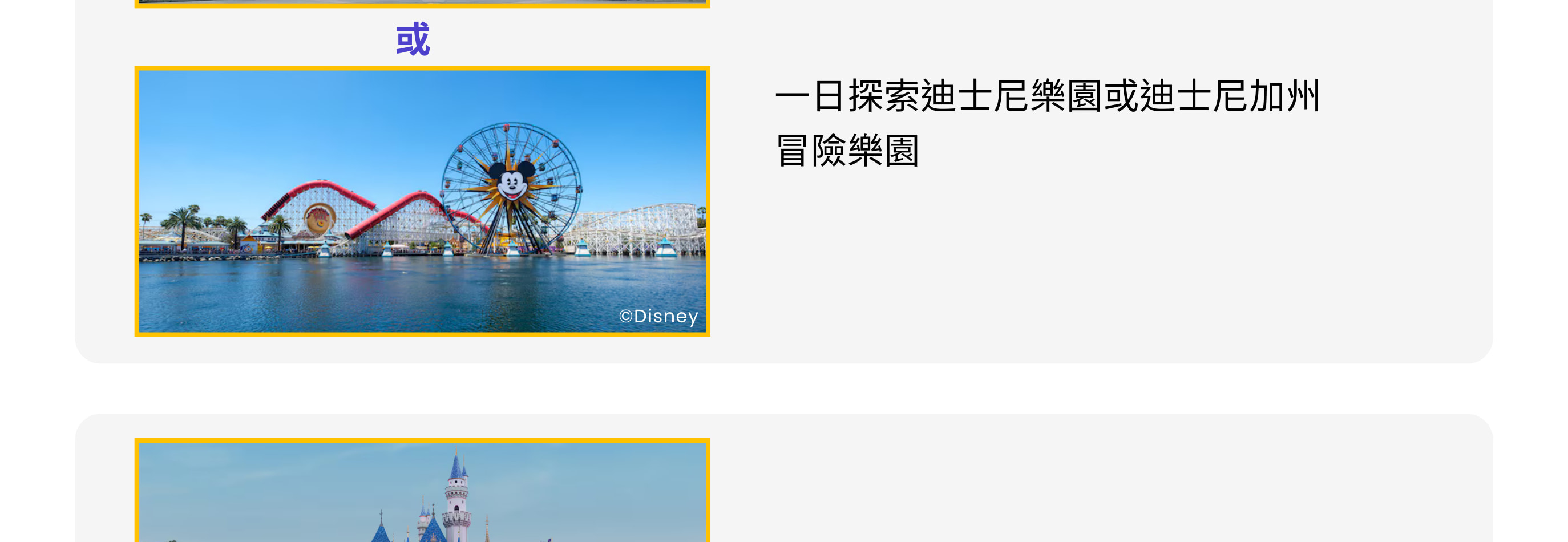 - 暢玩迪士尼樂園和迪士尼加州冒險樂園,享受刺激好玩的遊樂設施、迷人的體驗,並與深受喜愛的迪士尼角色一起度過歡樂時刻吧!