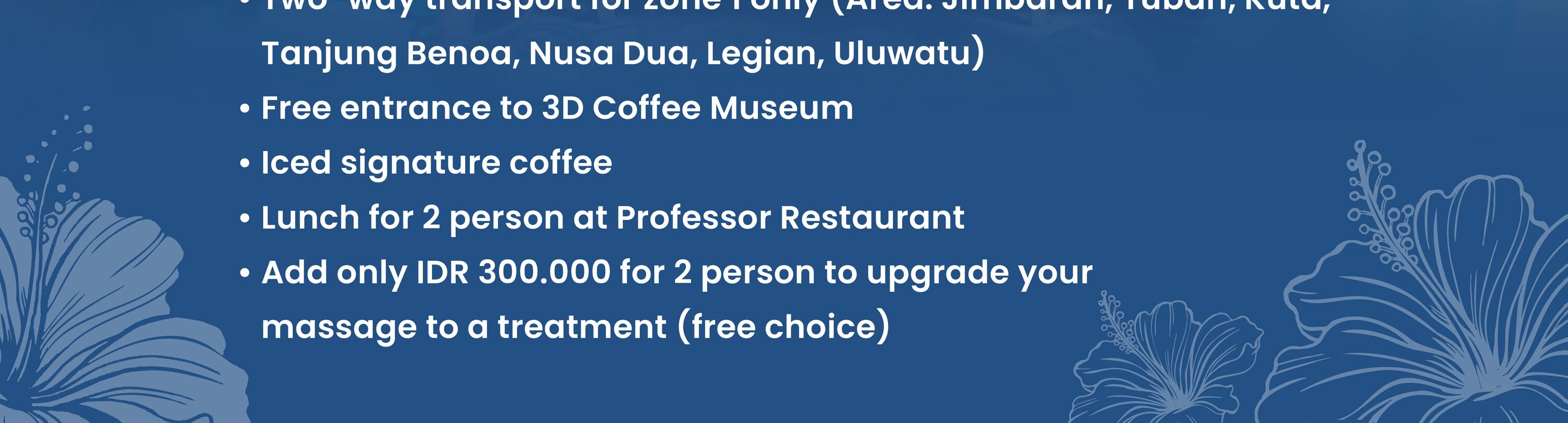 ZONE 1(金巴蘭、圖班、庫塔、丹戎貝諾瓦、努沙杜瓦、勒吉安、烏魯瓦圖)的顧客,最低消費滿 IDR 600,000 即可享受免費單程接送服務(請注意:您可以選擇接機或送機服務),最低消費滿 IDR 1,100,000 即可享受免費雙程接送服務。