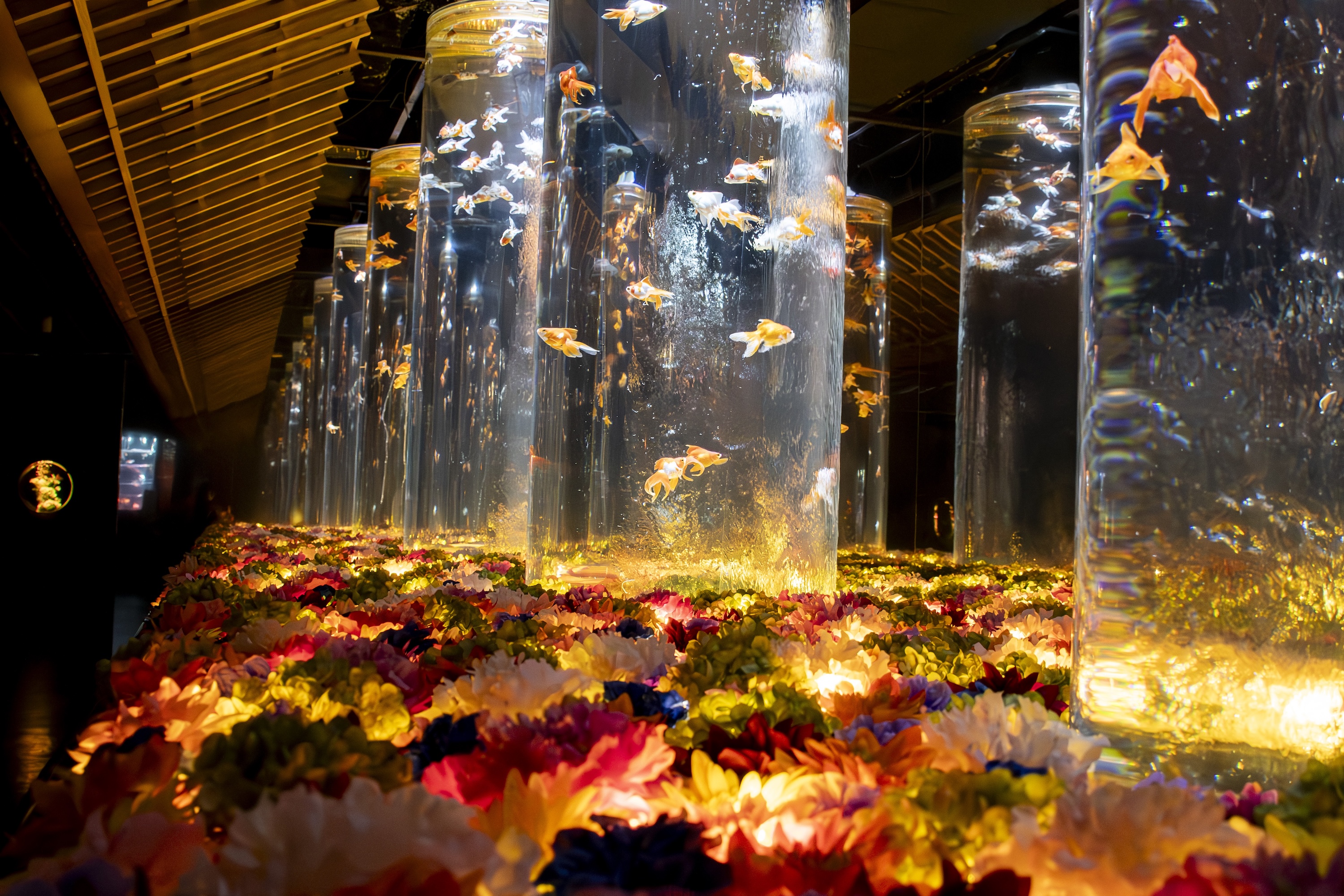**金魚瀑布:**參觀金魚瀑布,這裡的魚缸層層堆疊,宛如流動的瀑布一般。