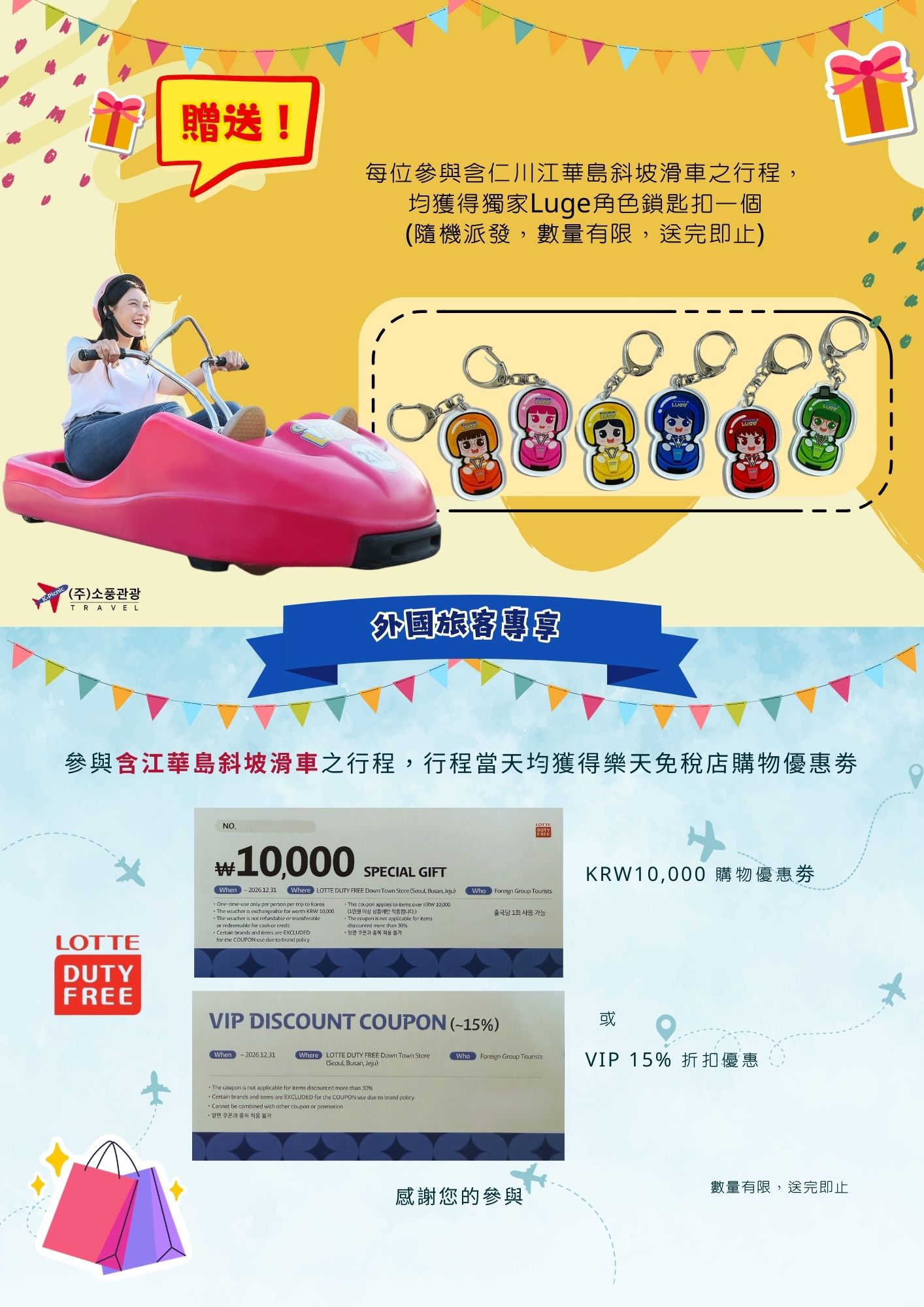 - 如果江華海邊度假村的斜坡滑車因天氣狀況或其他原因而無法使用,將會更換為其他景點。