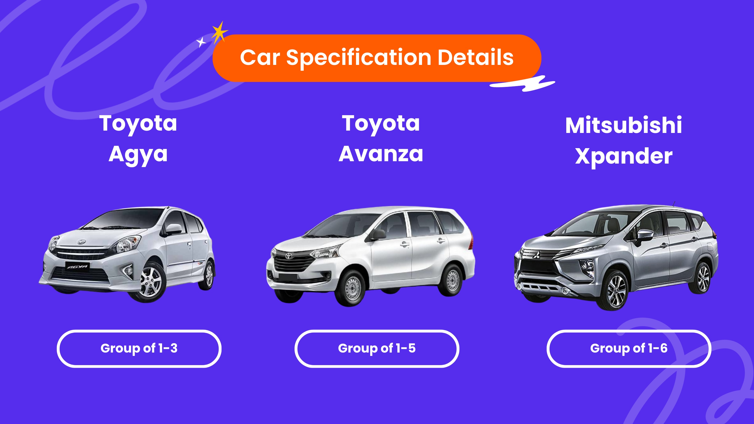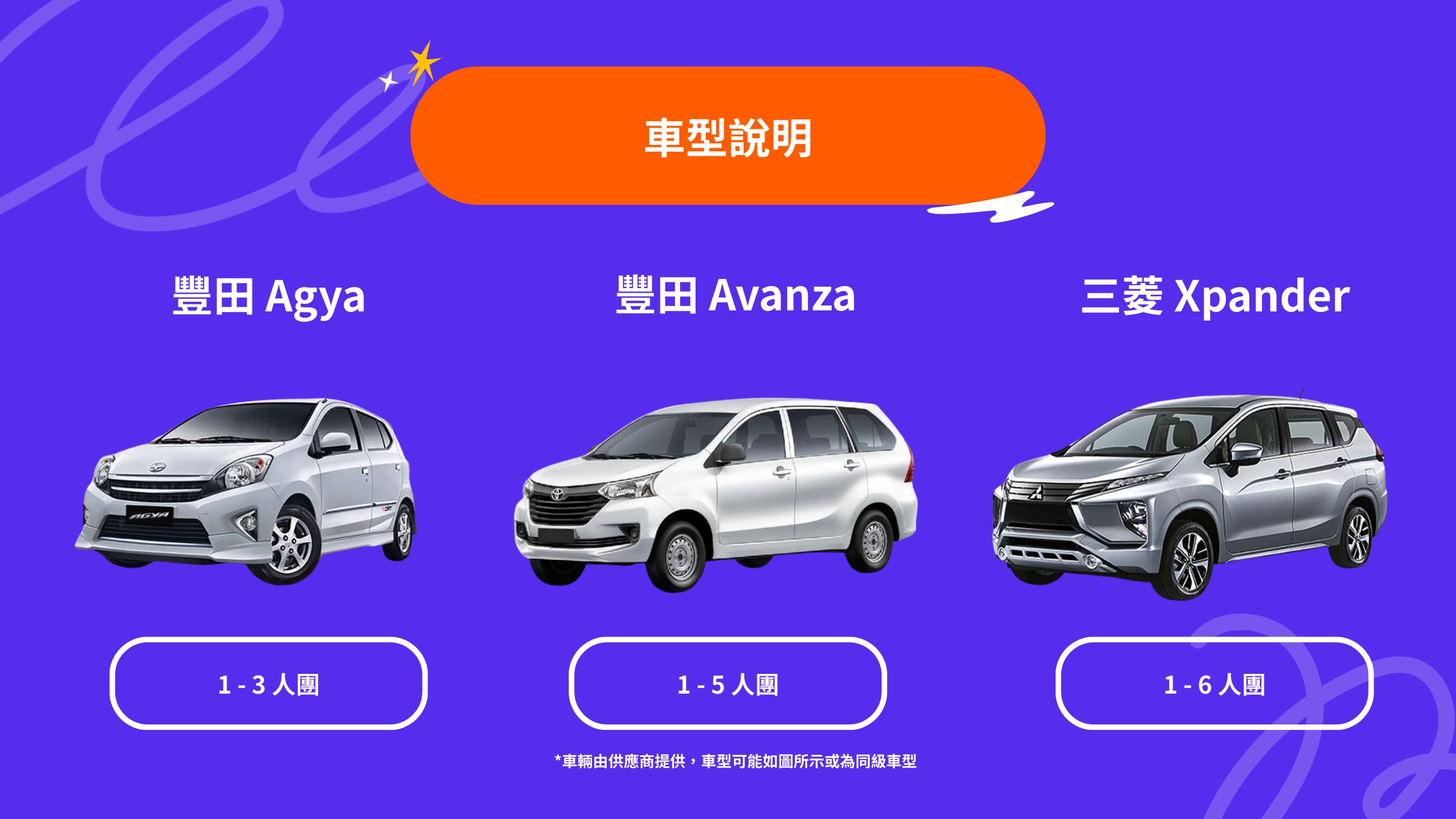 - 廠牌:Toyota Avanza、Suzuki Ertiga或同級