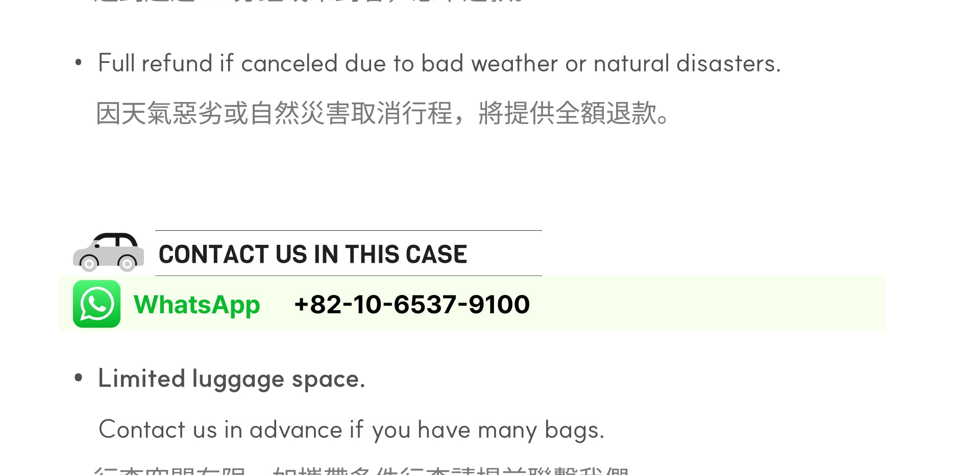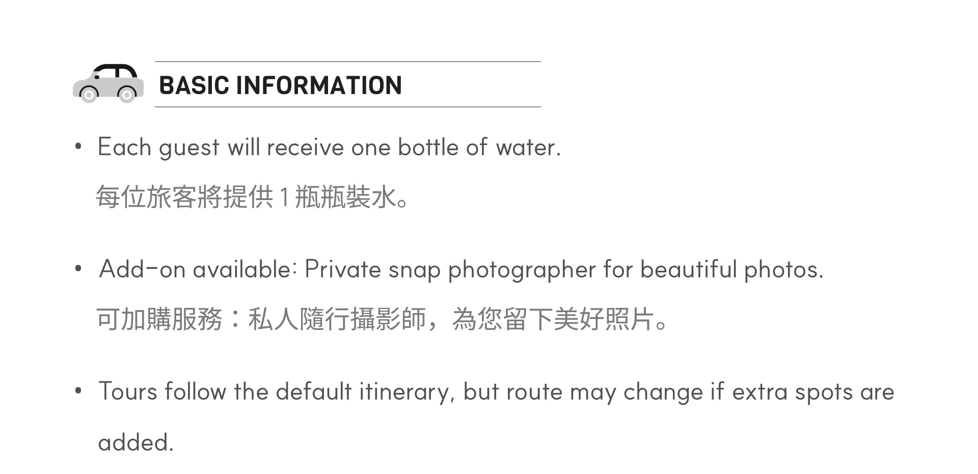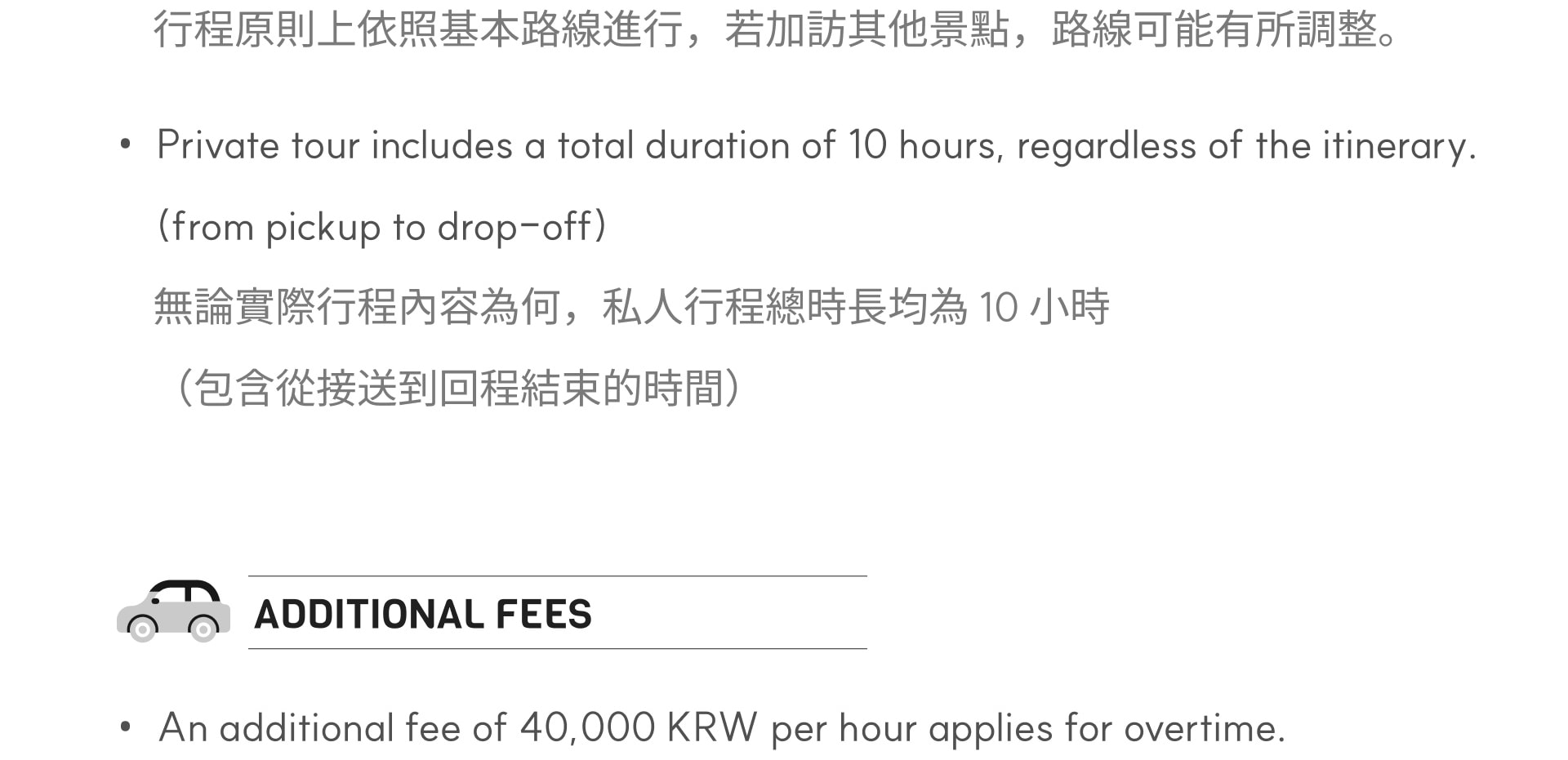 - 私人旅遊總時長為10小時,不限行程。如果總時長超過10小時,每小時將收取40,000韓元的額外費用。