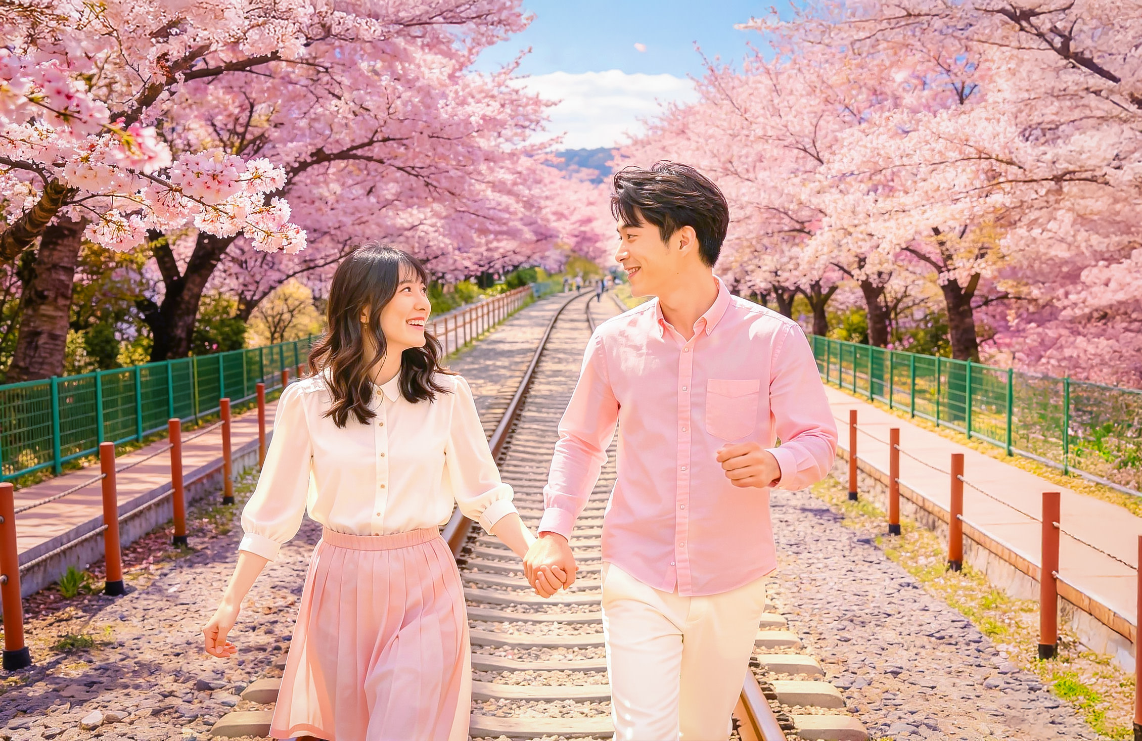 🚂 慶和車站 (GYEONGHWA STATION):櫻花在鐵軌上方交織成拱形,構成一幅如詩如畫的春日美景。