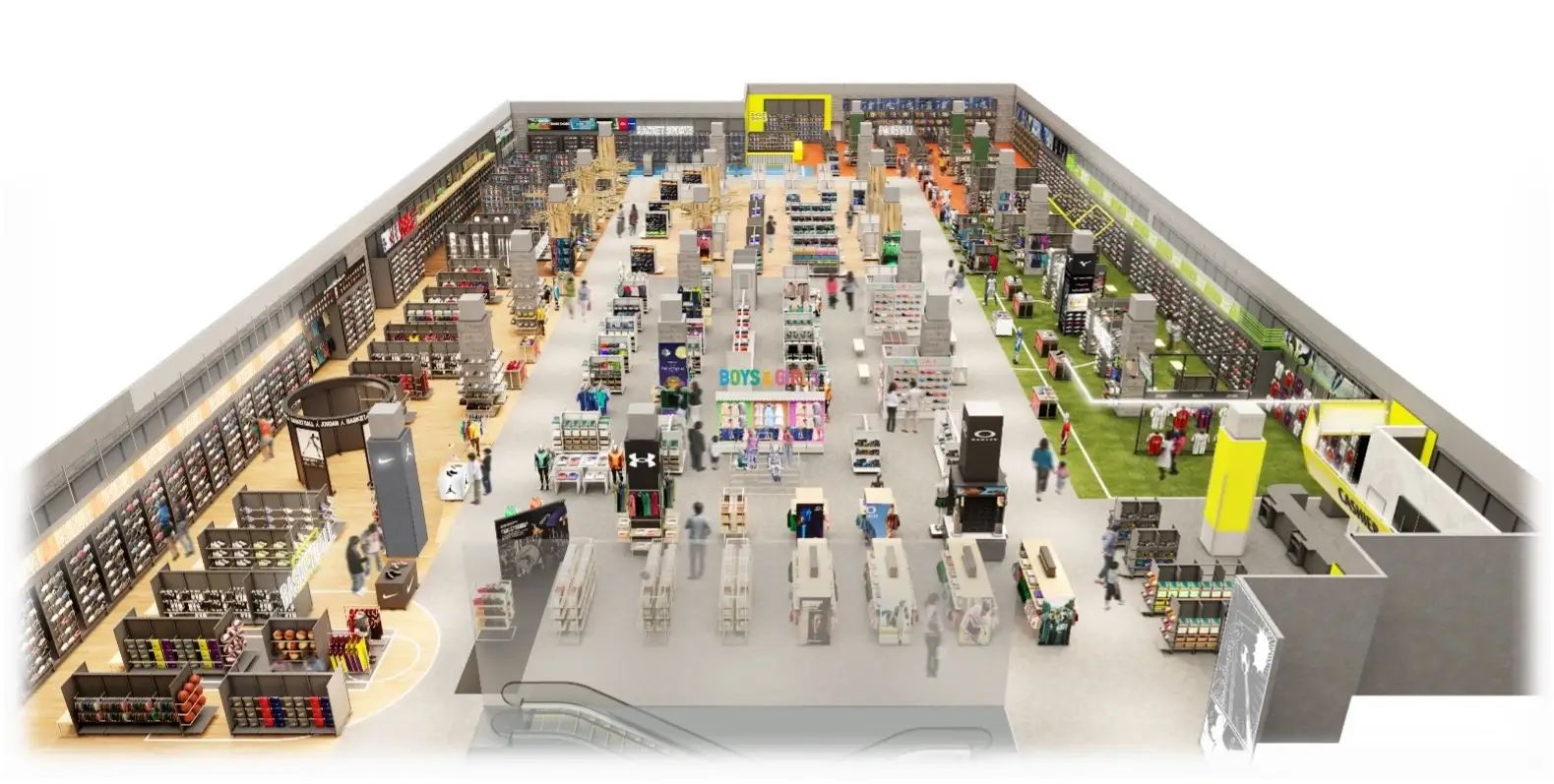 館內以人工草皮與球場作設計主題營造臨場感,亦有集結跑步、健身、戶外、足球、籃球與棒球等熱門運動體驗專區,客人可盡情購物打卡!