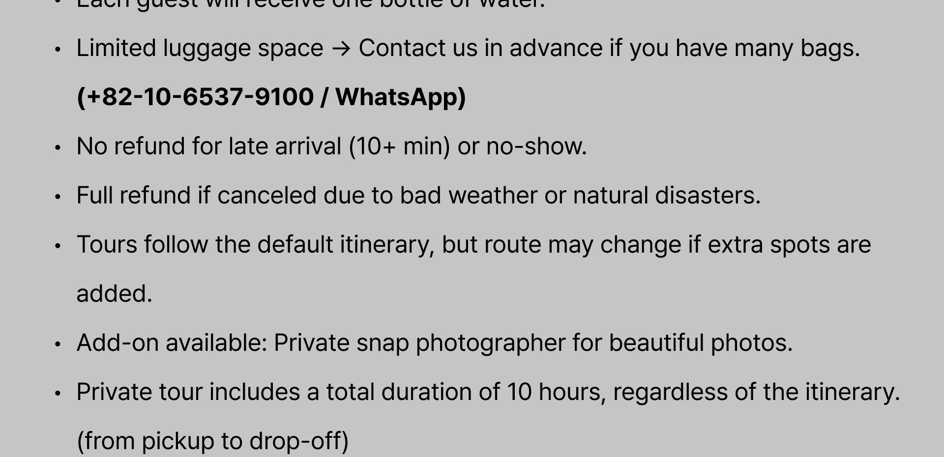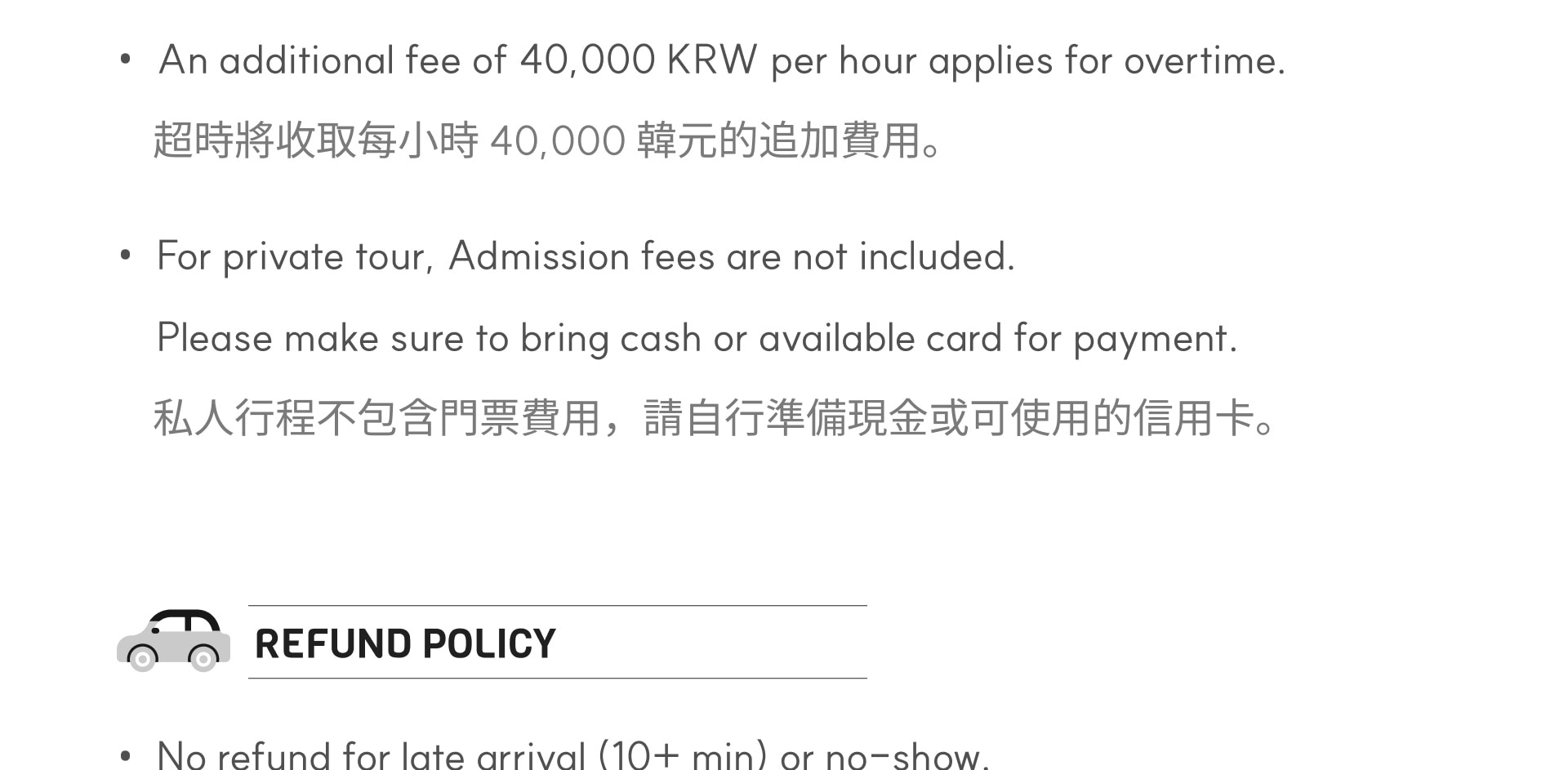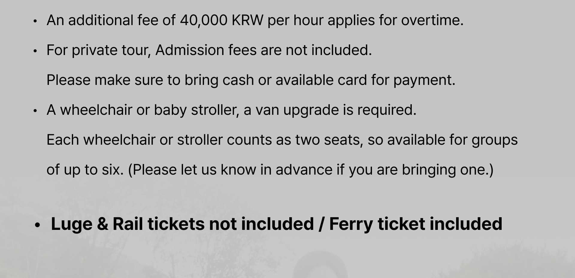 若總時長(從接載到送返)超過 10 小時,將加收每小時 40,000 韓元的費用。 - 私人包車行程不包含門票。請務必攜帶現金或可使用的信用卡支付。