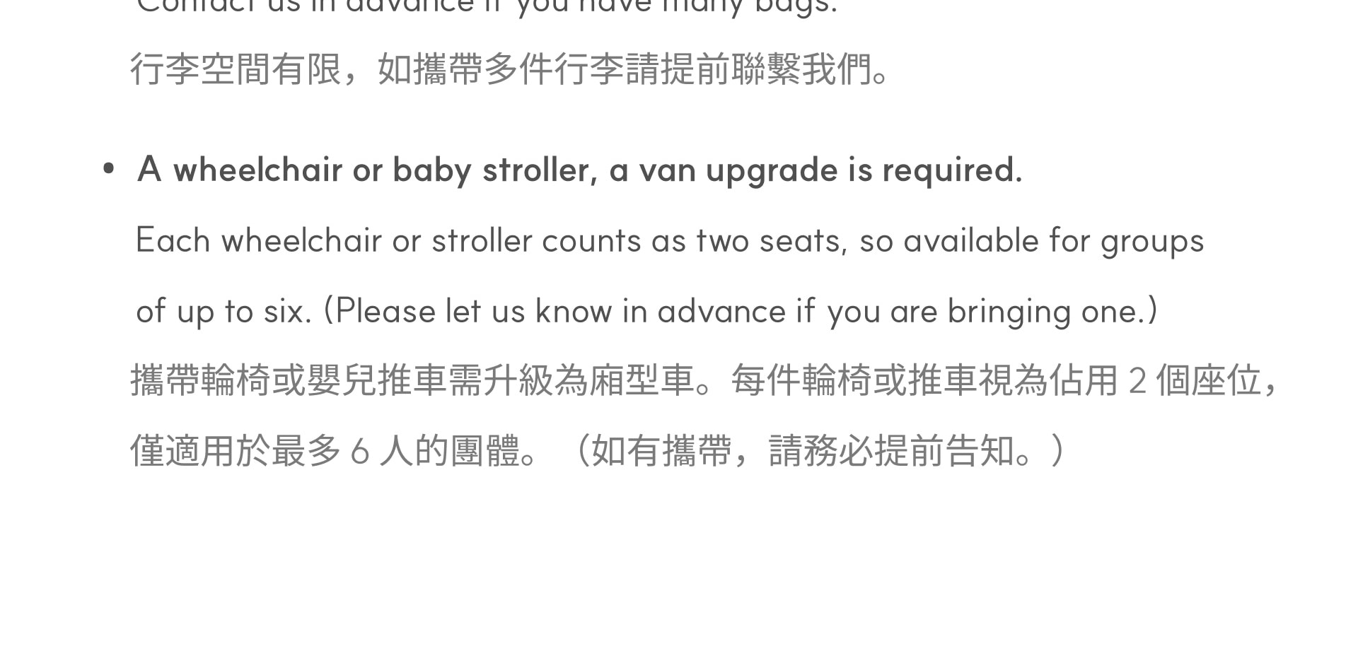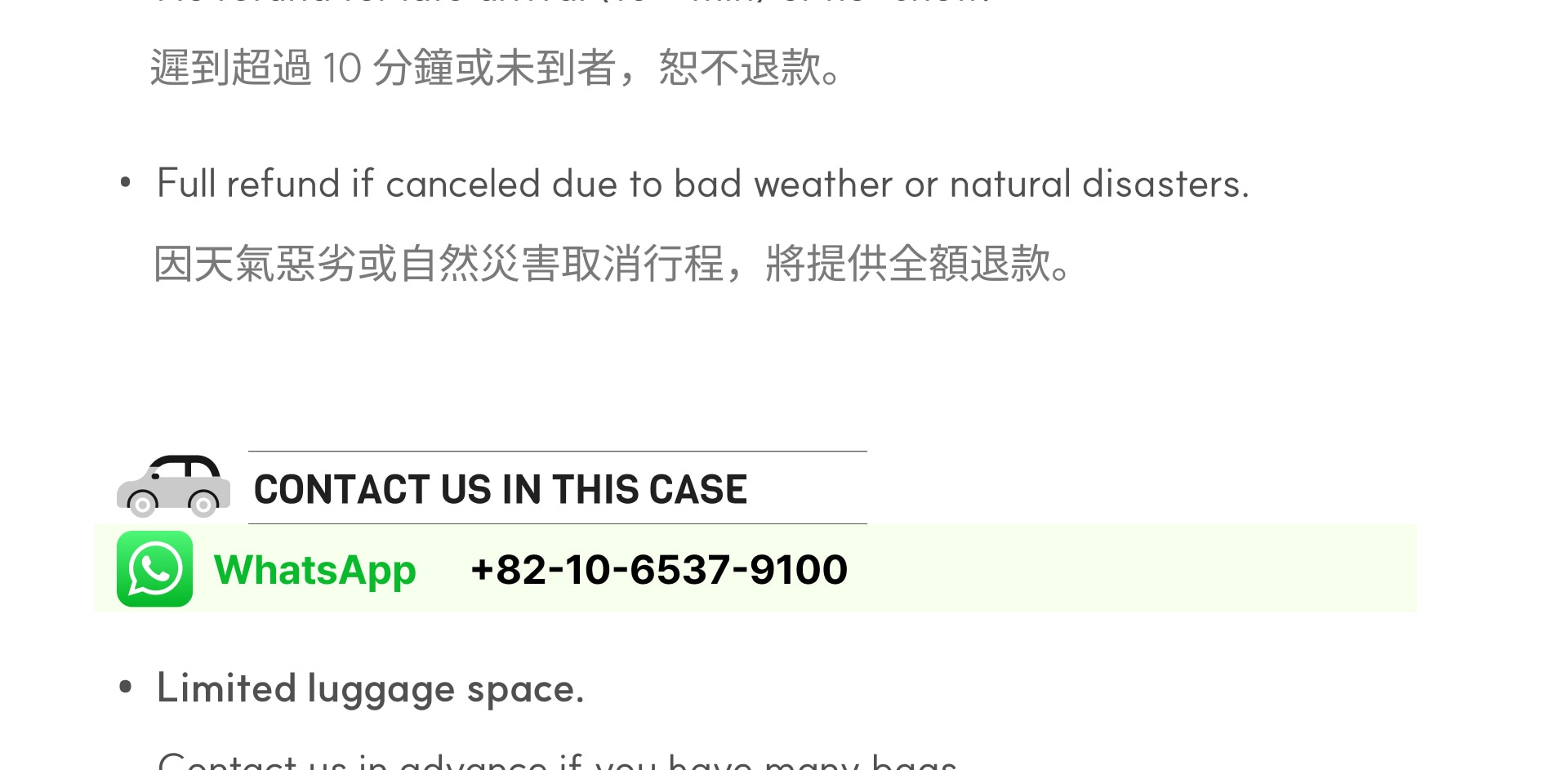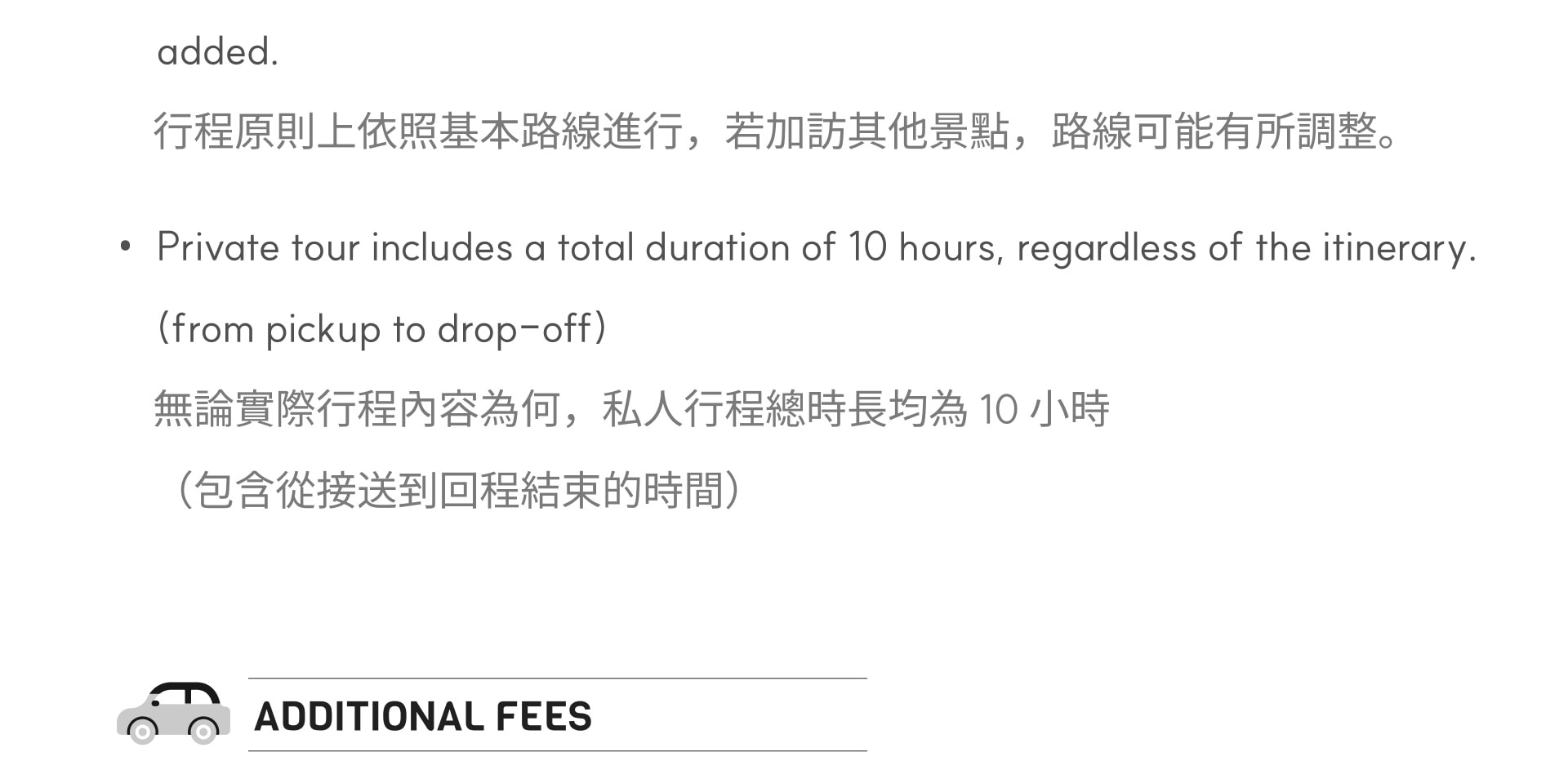 - 私人包車行程總時長為 10 小時,不論行程安排為何。