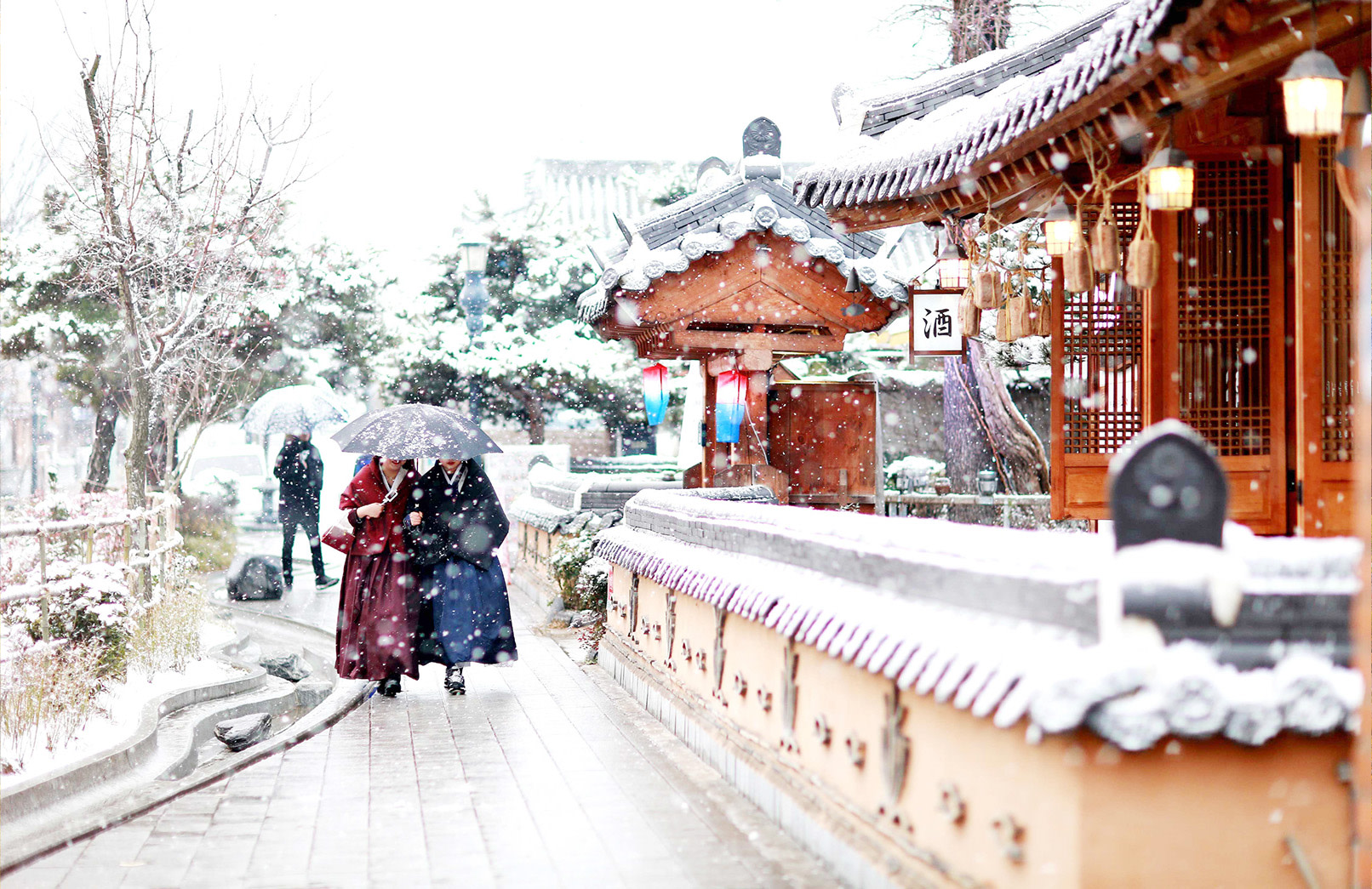 下雪時,全州韓屋村彷彿步入韓式童話故事。寧靜的巷弄、白雪輕踩的聲音,以及閃爍的燈籠,營造出寧靜又浪漫的氛圍。
