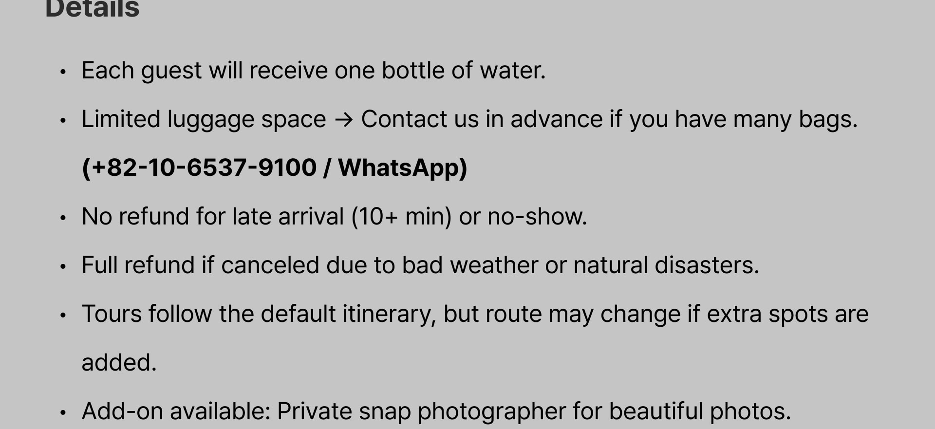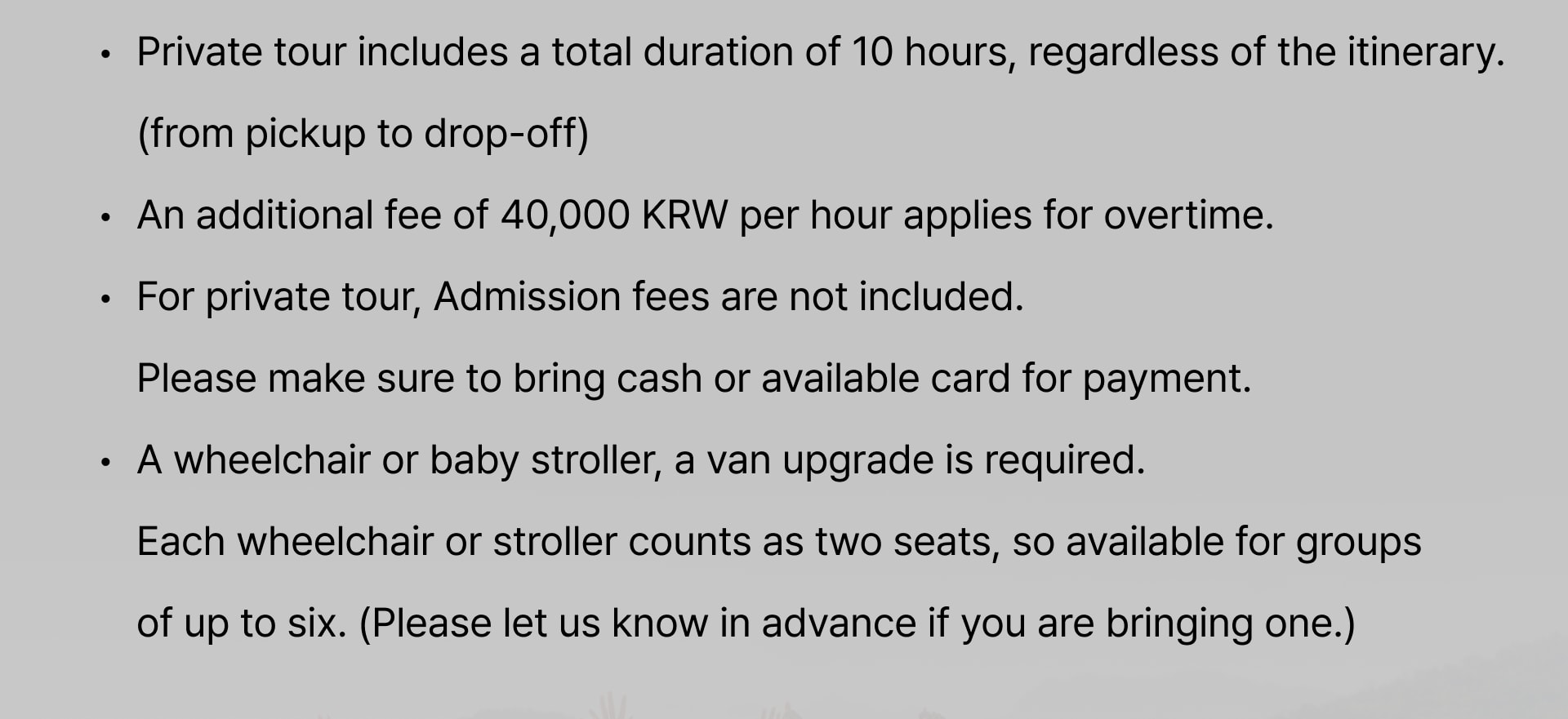 - 私人旅遊總時長為10小時,不論行程如何。如果總時長超過10小時(從接載到送返),每小時將收取額外40,000韓元費用。