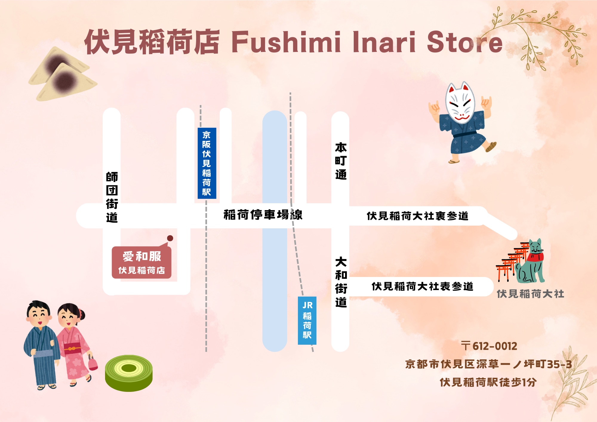 距離京都代表性的熱門觀光地「伏見稻荷大社」步行5分鐘。身著和服漫步於被硃紅色染紅的千本鳥居,彷彿置身於電影場景中,可以拍攝到特別的照片。