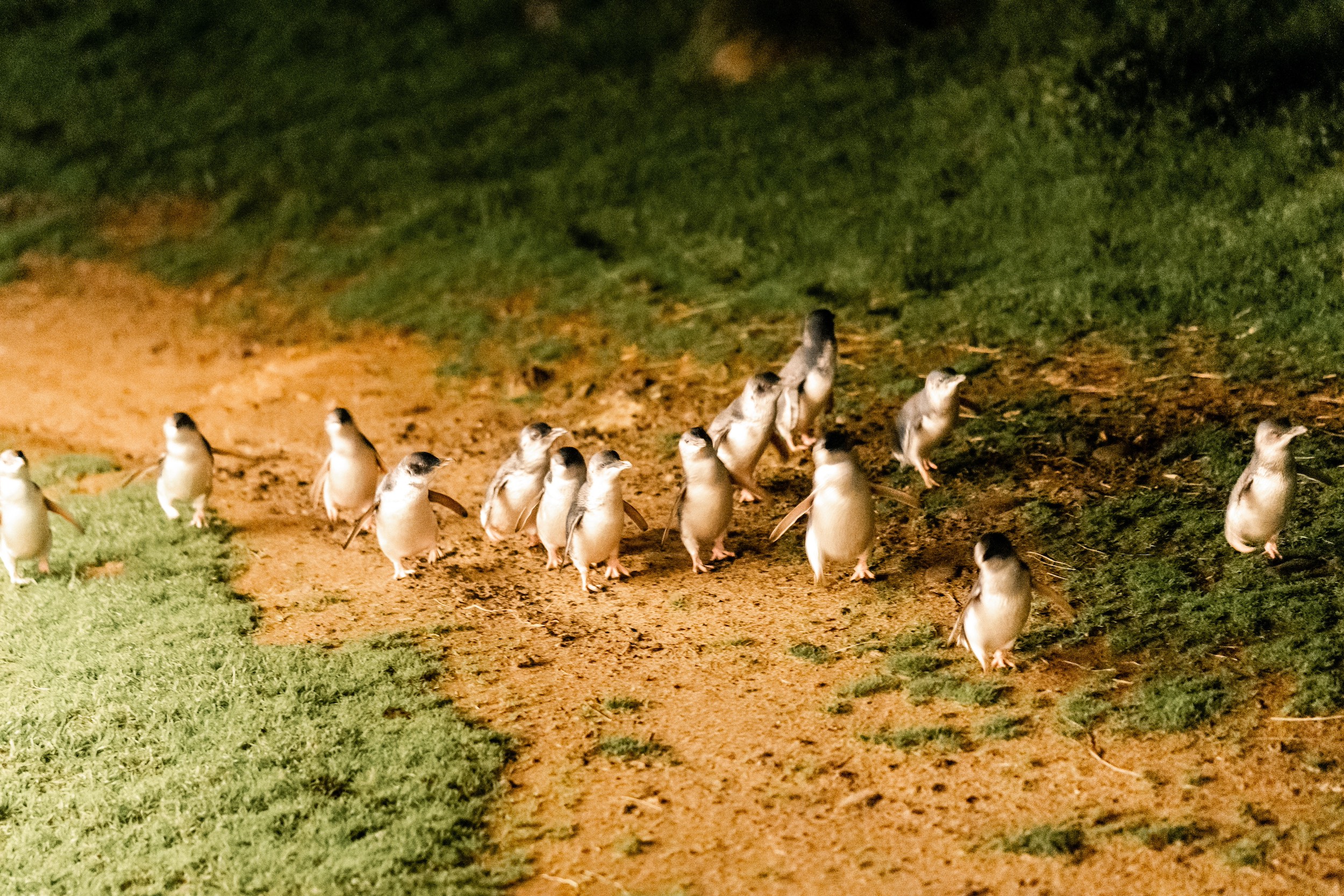 接著前往菲利普島,探索諾比司 (The Nobbies) 壯麗的海岸線,這裡有噴水洞、木棧道觀景台和當地野生動物。夕陽西下時,在企鵝歸巢遊行 (Penguin Parade) 找個好位置,觀賞數百隻小企鵝在捕魚一天後搖搖擺擺地返回岸邊——這絕對是一場真正神奇的自然奇觀。
