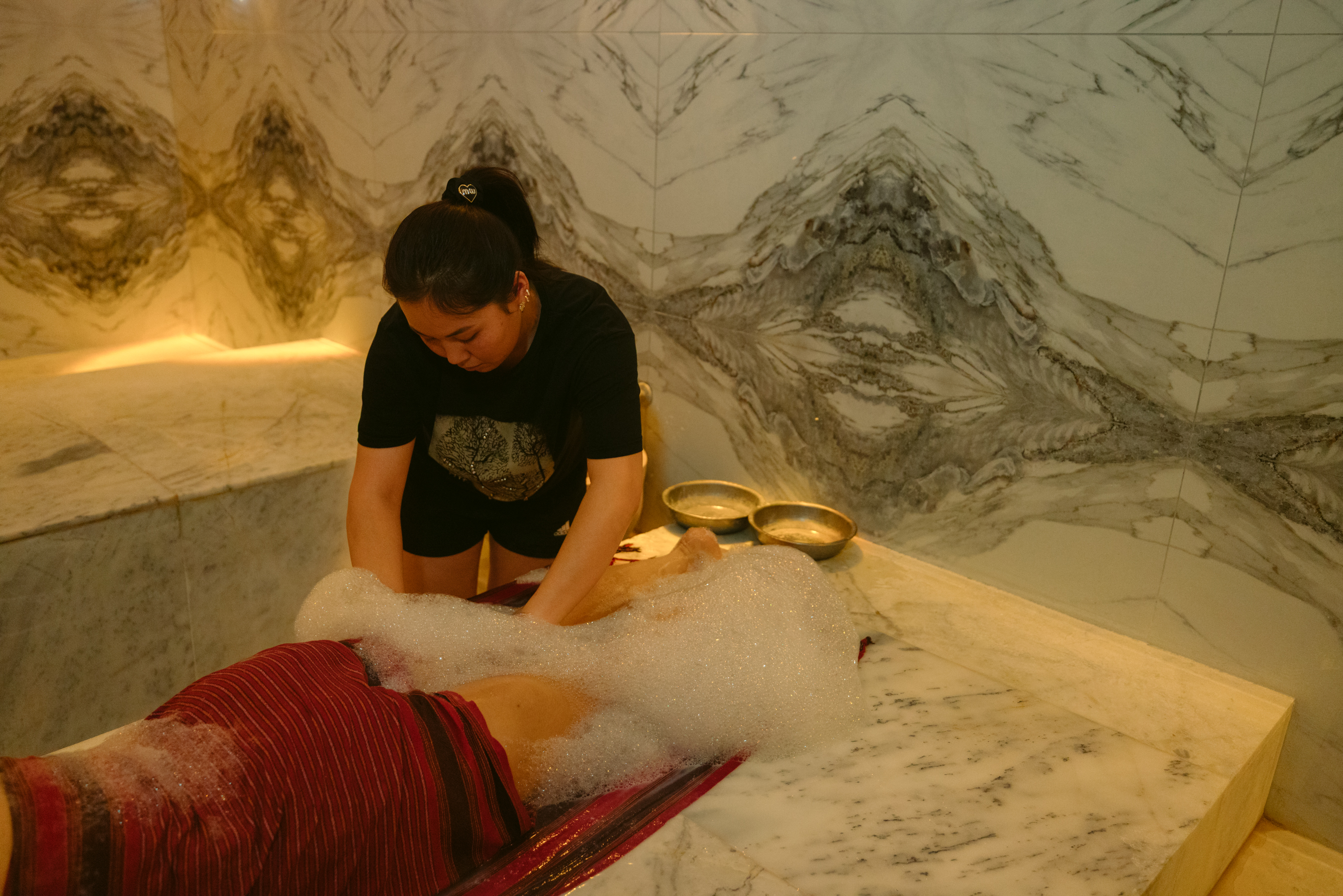 首先,您將躺在溫暖的石頭上,我們熟練的工作人員會熟練地向您身上傾倒熱水,然後進行徹底的擦洗,去除角質,讓您的皮膚感覺無比光滑和容光煥發。接下來是奢華的泡沫按摩,不僅可以清潔您的身體,還能讓您獲得深刻的煥發感。