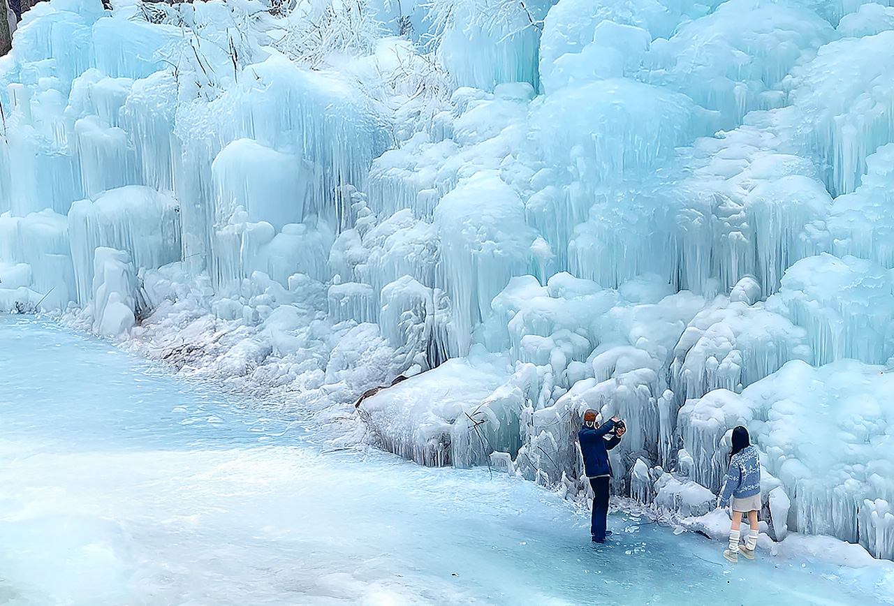 ❄️🩵 站在耀眼的藍色冰牆前,彷彿置身於一個真實的冬季奇幻世界。